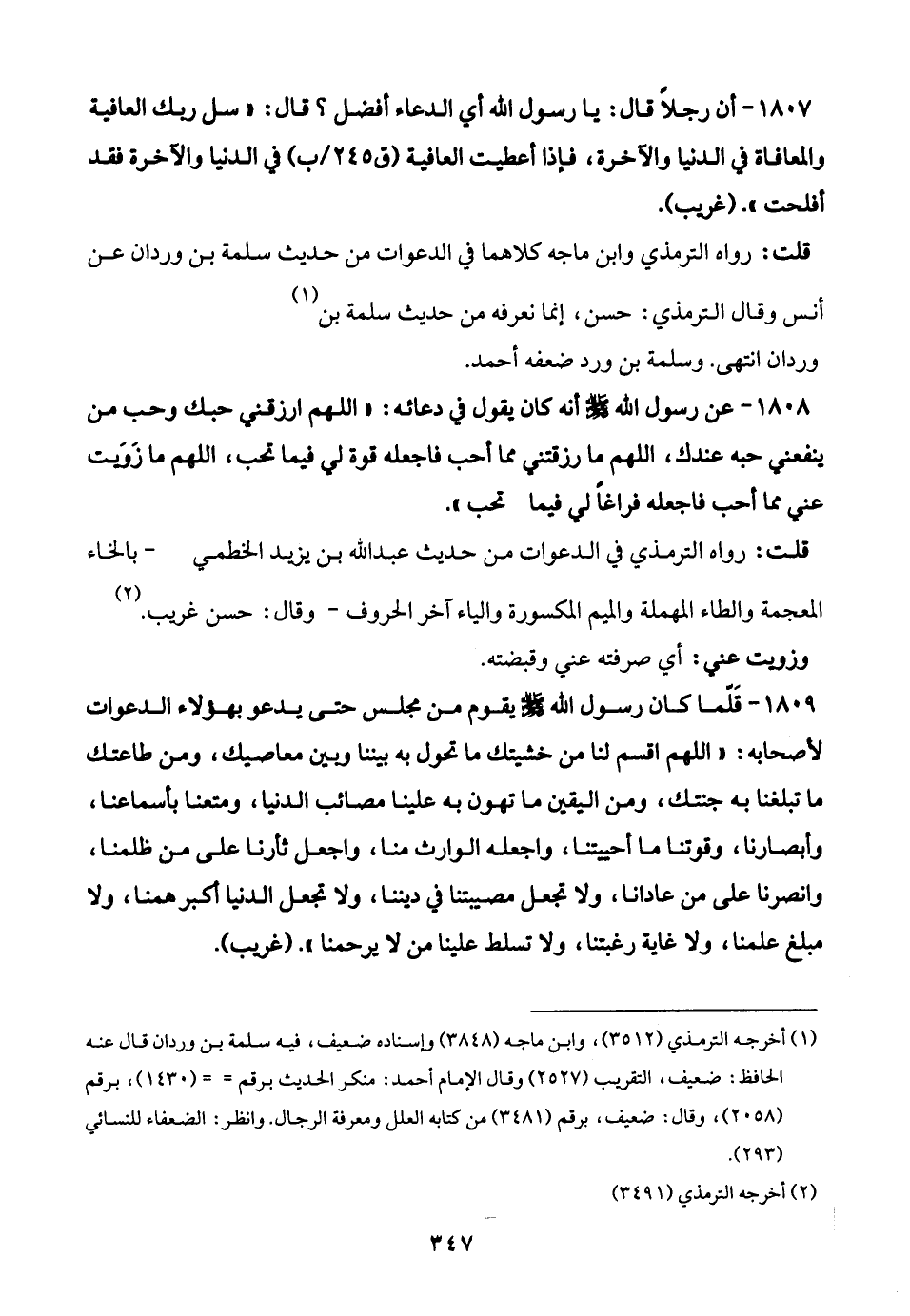 1807 - أن رجلًا قال: يا رسول الله أي الدعاء أفضل؟ قال: "سل ربك العافية والمعافاة في الدنيا والآخرة، فإذا أعطيت العافية في الدنيا والآخرة فقد أفلحت". (غريب).