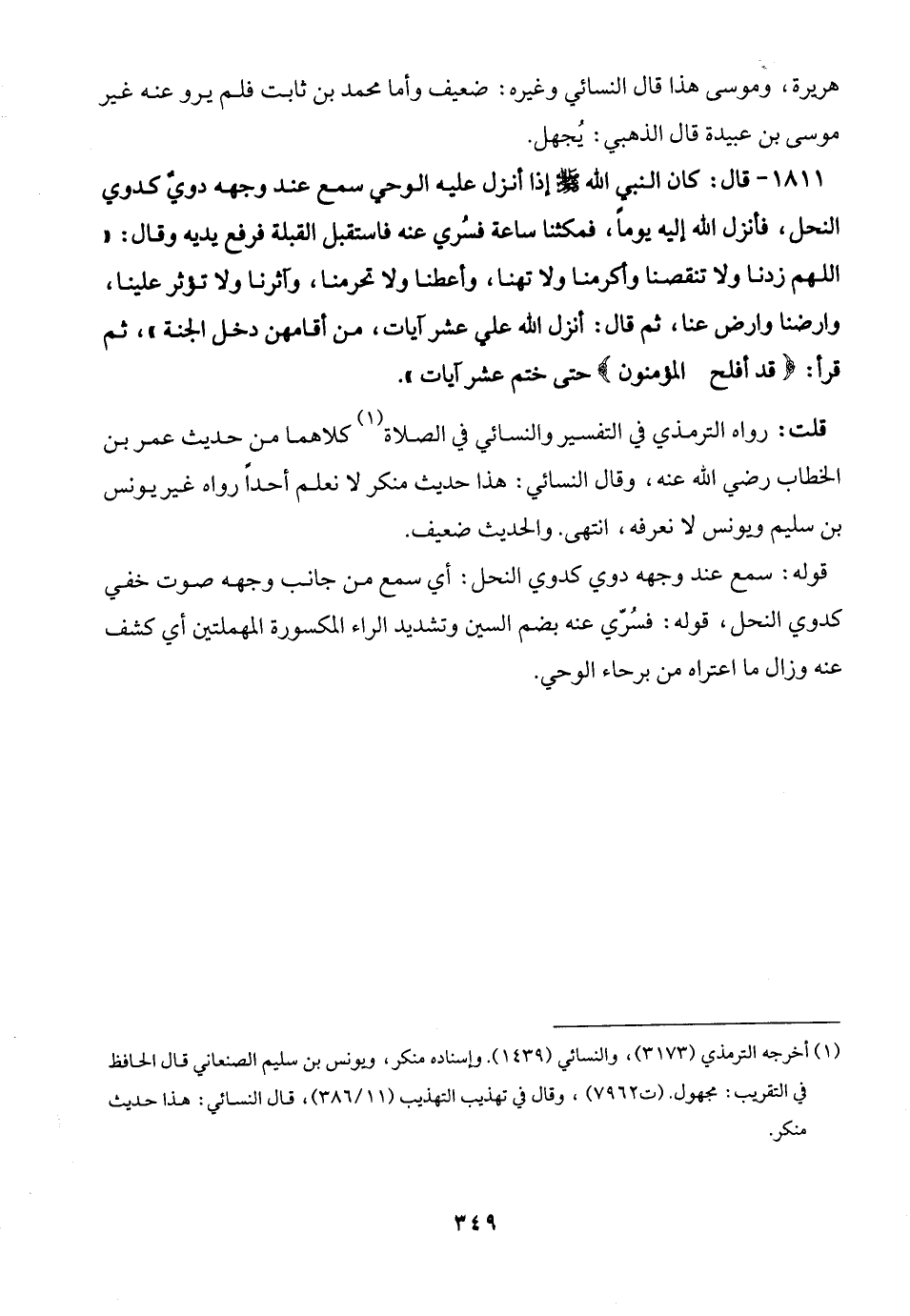 1811 - قال: كان النبي الله - صلى الله عليه وسلم - إذا أنزل عليه الوحي سمع عند وجهه دويٌّ كدوي النحل، فأنزل الله إليه يومًا، فمكثنا ساعة فسُري عنه فاستقبل القبلة فرفع يديه وقال: "اللهم زدنا ولا تنقصنا وأكرمنا ولا تهنا، وأعطنا ولا تحرمنا، وآثرنا ولا ثؤثر علينا، وارضنا وارض عنا، ثم قال: أنزل الله علي عشر آيات، من أقامهن دخل الجنة"، ثم قرأ: {قَدْ أَفْلَحَ الْمُؤْمِنُونَ (1)} [المؤمنون: 1] حتى ختم عشر آيات".