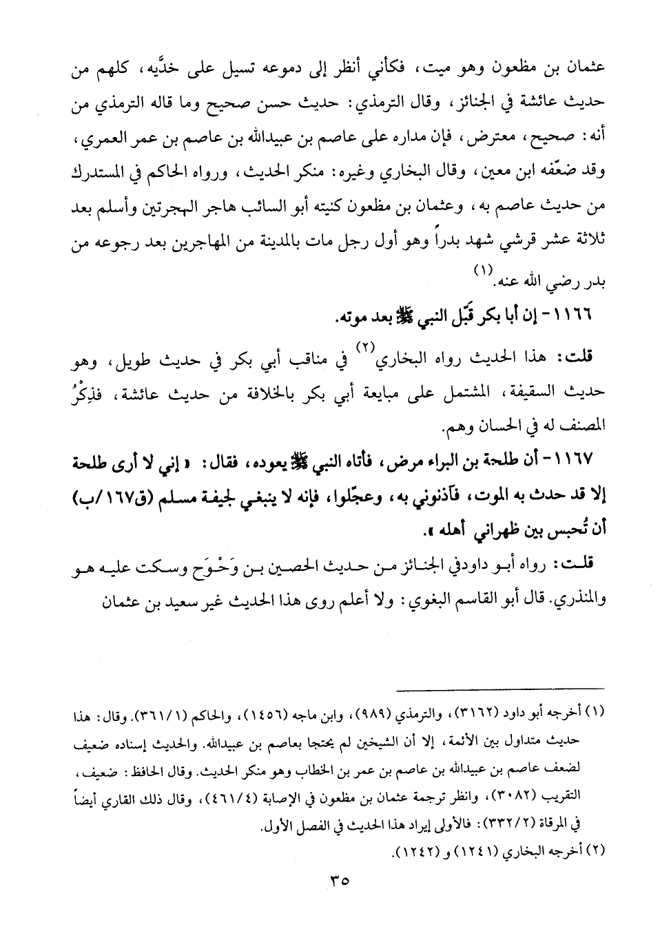 1167 - أن طلحة بن البراء مرض، فأتاه النبي - صلى الله عليه وسلم - يعوده، فقال: "إني لا أرى طلحة إلا قد حدث به الموت، فآذنوني به، وعجّلوا، فإنه لا ينبغي لجيفة مسلم أن تُحبس بين ظهراني أهله".