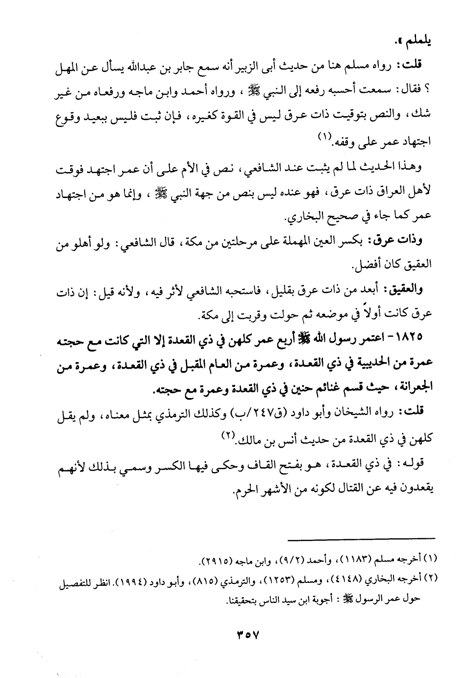 1825 - اعتمر رسول الله - صلى الله عليه وسلم - أربع عمر كلهن في ذي القعدة إلا التي كانت مع حجته عمرة من الحديبية في ذي القعدة، وعمرة من العام المقبل في ذي القعدة، وعمرة من الجعرانة، حيث قسم غنائم حنين في ذي القعدة وعمرة مع حجته.