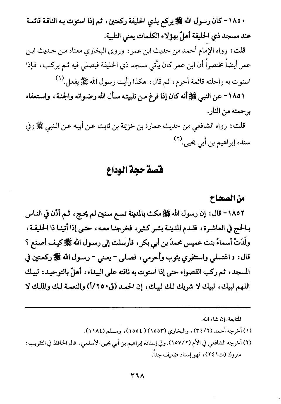 1850 - كان رسول الله - صلى الله عليه وسلم - يركع بذي الحليفة ركعتين، ثم إذا استوت به الناقة قائمة عند مسجد ذي الحليفة أهلّ بهؤلاء الكلمات يعني التلبية.