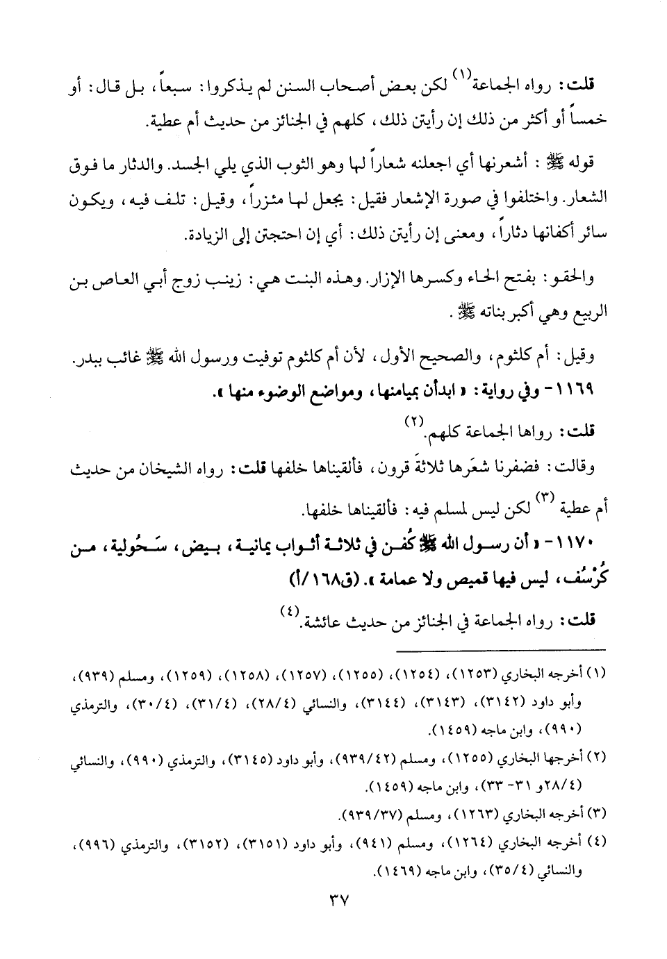 1170 - "أن رسول الله - صلى الله عليه وسلم - كُفن في ثلاثة أثواب يمانية، بيض، سَحُولية، من كُرْسُف، ليس فيها قميص ولا عمامة".