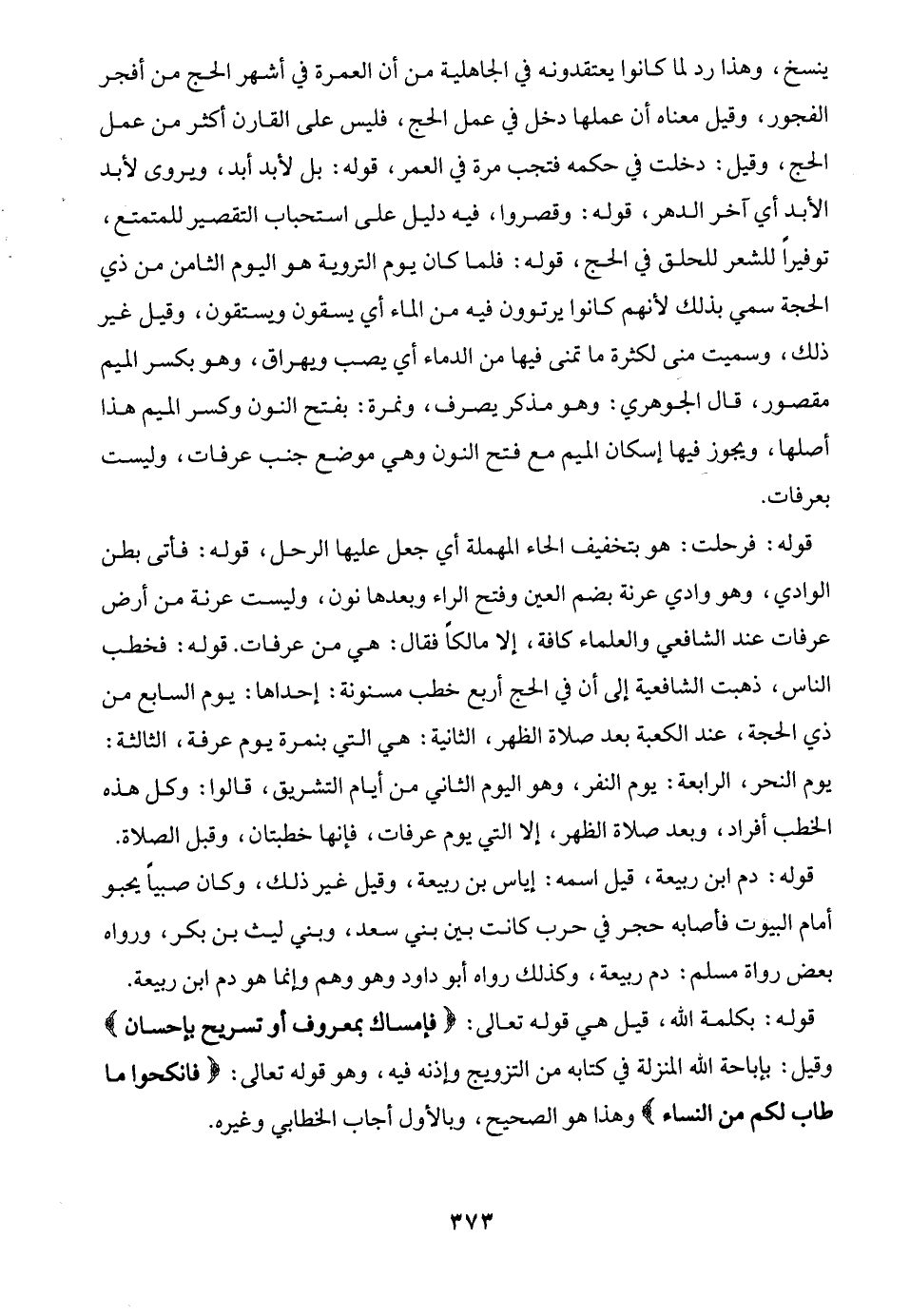 قوله: فرحلت: هو بتخفيف الحاء المهملة أي جعل عليها الرحل، قوله: فأتى بطن الوادي، وهو وادي عرنة بضم العين وفتح الراء وبعدها نون، وليست عرنة من أرض عرفات عند الشافعي والعلماء كافة، إلا مالكًا فقال: هي من عرفات. قوله: فخطب الناس، ذهبت الشافعية إلى أن في الحج أربع خطب مسنونة: إحداها: يوم السابع من ذي الحجة، عند الكعبة بعد صلاة الظهر، الثانية: هي التي بنمرة يوم عرفة، الثالثة: يوم النحر، الرابعة: يوم النفر، وهو اليوم الثاني من أيام التشريق، قالوا: وكل هذه الخطب أفراد، وبعد صلاة الظهر، إلا التي يوم عرفات، فإنها خطبتان، وقبل الصلاة.