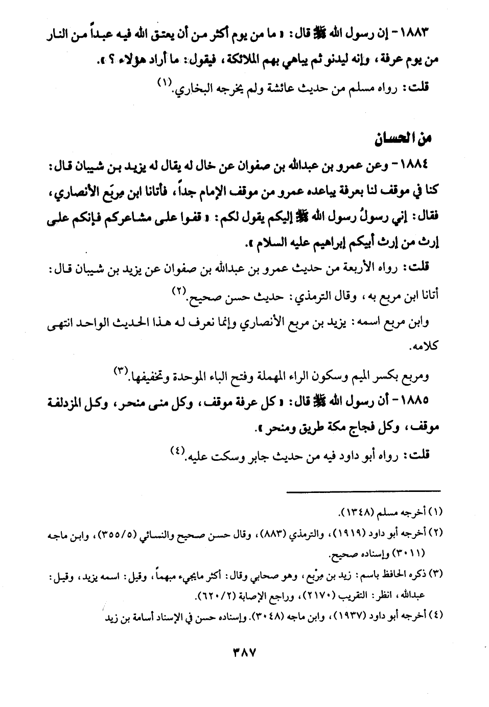 1884 - وعن عمرو بن عبد الله بن صفوان عن خال له يقال له يزيد بن شيبان قال: كنا في موقف لنا بعرفة يباعده عمرو من موقف الإمام جدًّا، فأتانا ابن مِربَع الأنصاري، فقال: إني رسولُ رسول الله - صلى الله عليه وسلم - إليكم يقول لكم: "قفوا على مشاعركم فإنكم على إرث من إرث أبيكم إبراهيم عليه السلام".