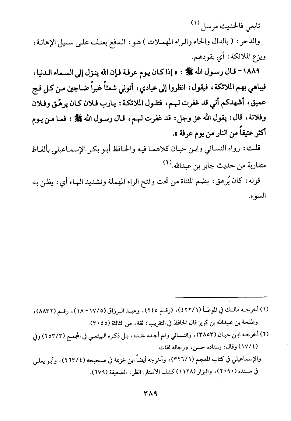1889 - قال رسول الله - صلى الله عليه وسلم -: "إذا كان يوم عرفة فإن الله ينزل إلى السماء الدنيا، فيباهي بهم الملائكة، فيقول: انظروا إلى عبادي، أتوني شعثًا غبرًا ضاجين من كل فج عميق، أشهدكم أني قد غفرت لهم، فتقول الملائكة: يا رب فلان كان يرهّق وفلان وفلانة، قال: يقول الله عز وجل: قد غفرت لهم، قال رسول الله - صلى الله عليه وسلم -: فما من يوم أكثر عتيقًا من النار من يوم عرفة".