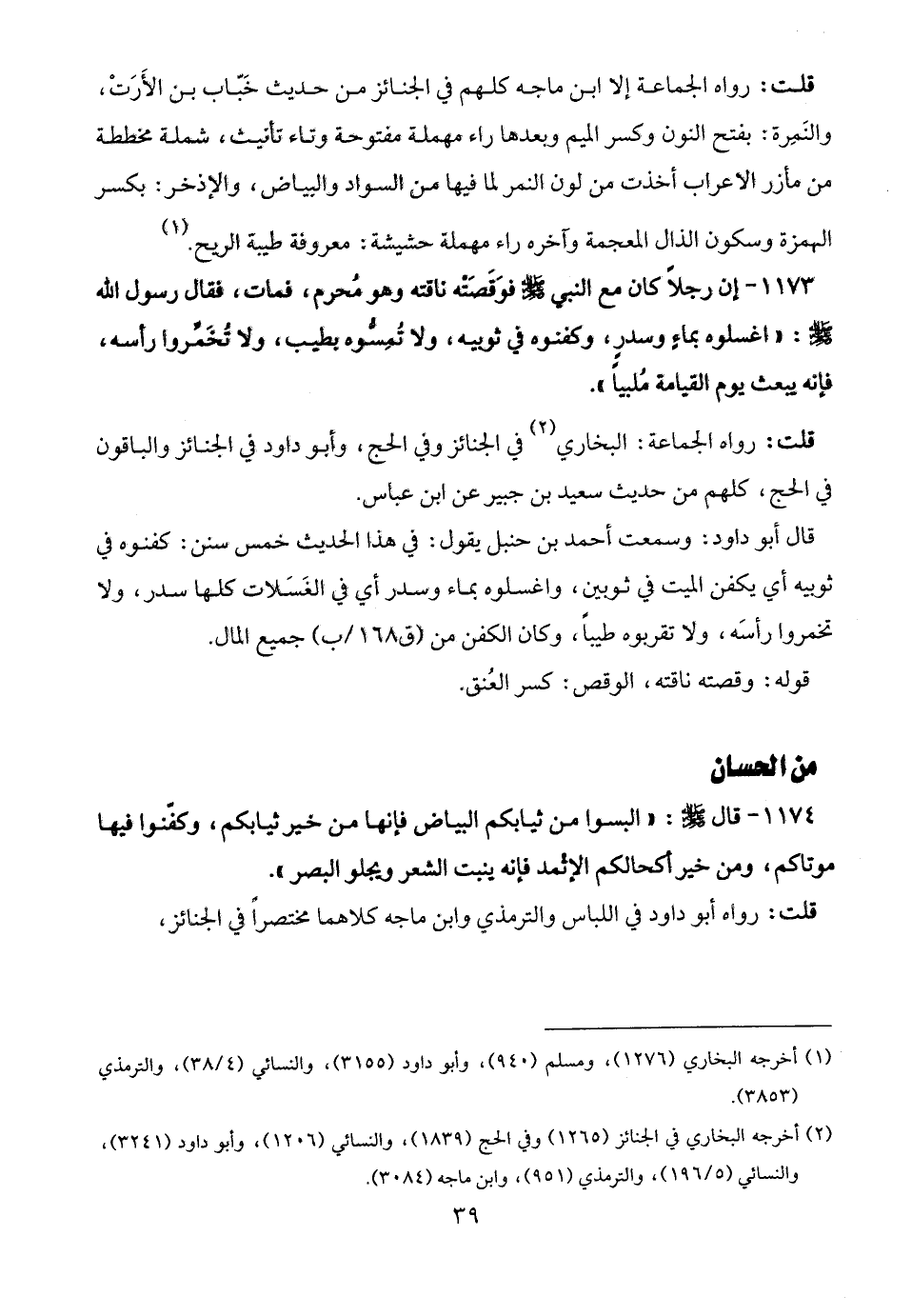 1173 - إن رجلًا كان مع النبي - صلى الله عليه وسلم - فوَقَصَتْه ناقته وهو مُحرم، فمات، فقال رسول الله - صلى الله عليه وسلم -: "اغسلوه بماءٍ وسدرٍ، وكفنوه في ثوبيه، ولا تُمِسُّوه بطيب، ولا تُخَمِّروا رأسه، فإنه يبعث يوم القيامة مُلبيًا".