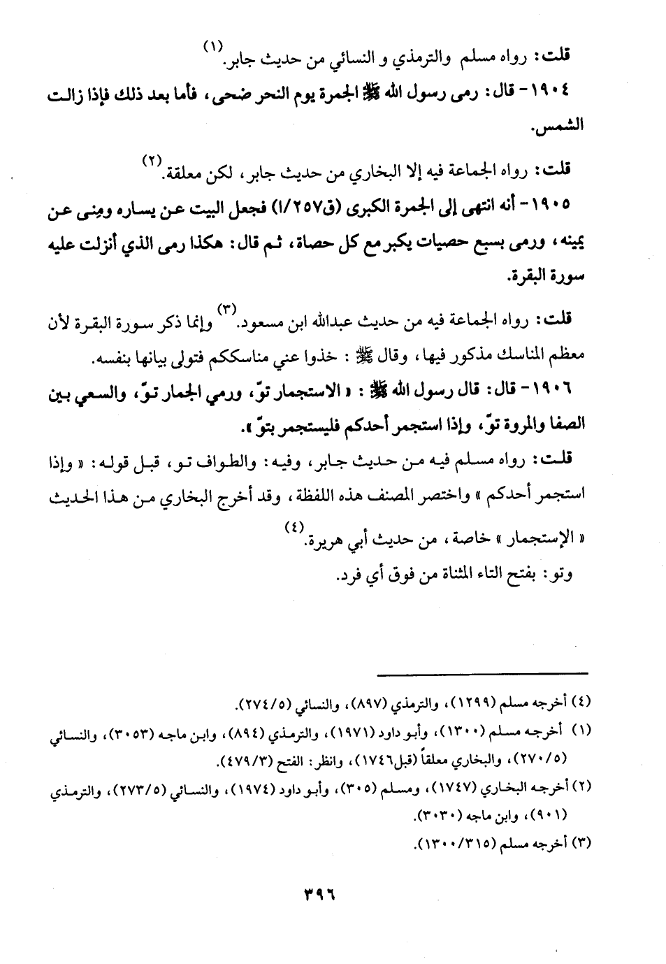 1905 - أنه انتهى إلى الجمرة الكبرى فجعل البيت عن يساره ومِنى عن يمينه، ورمى بسبع حصيات بكبر مع كل حصاة، ثم قال: هكذا رمى الذي أنزلت عليه سورة البقرة.