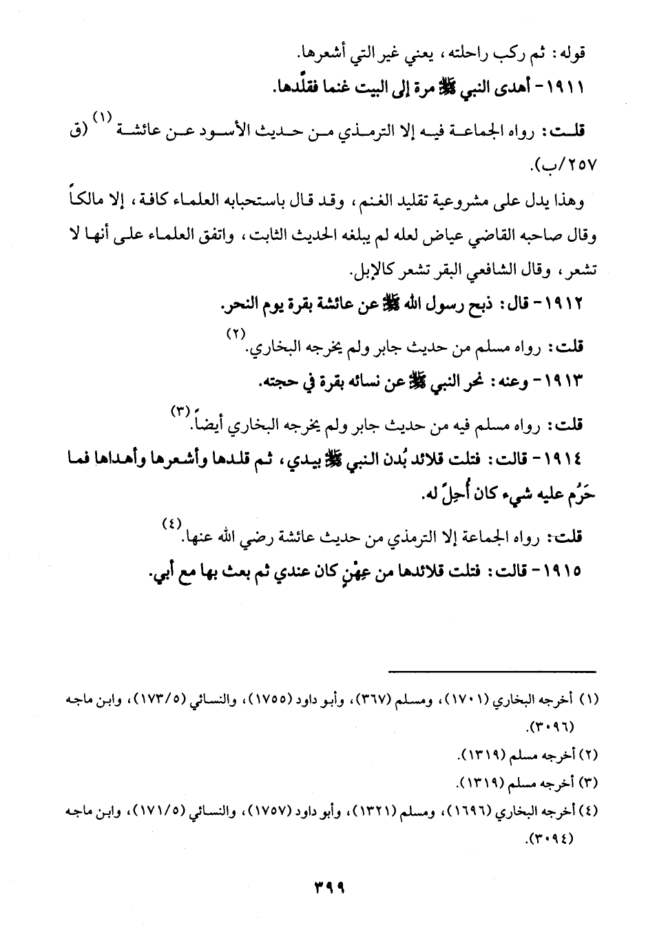 1914 - قالت: فتلت قلائد بُدن النبي -صلى الله عليه وسلم- بيدي، ثمَّ قلدها وأشعرها وأهداها فما حَرُم عليه شيء كان أُحِلَ له.