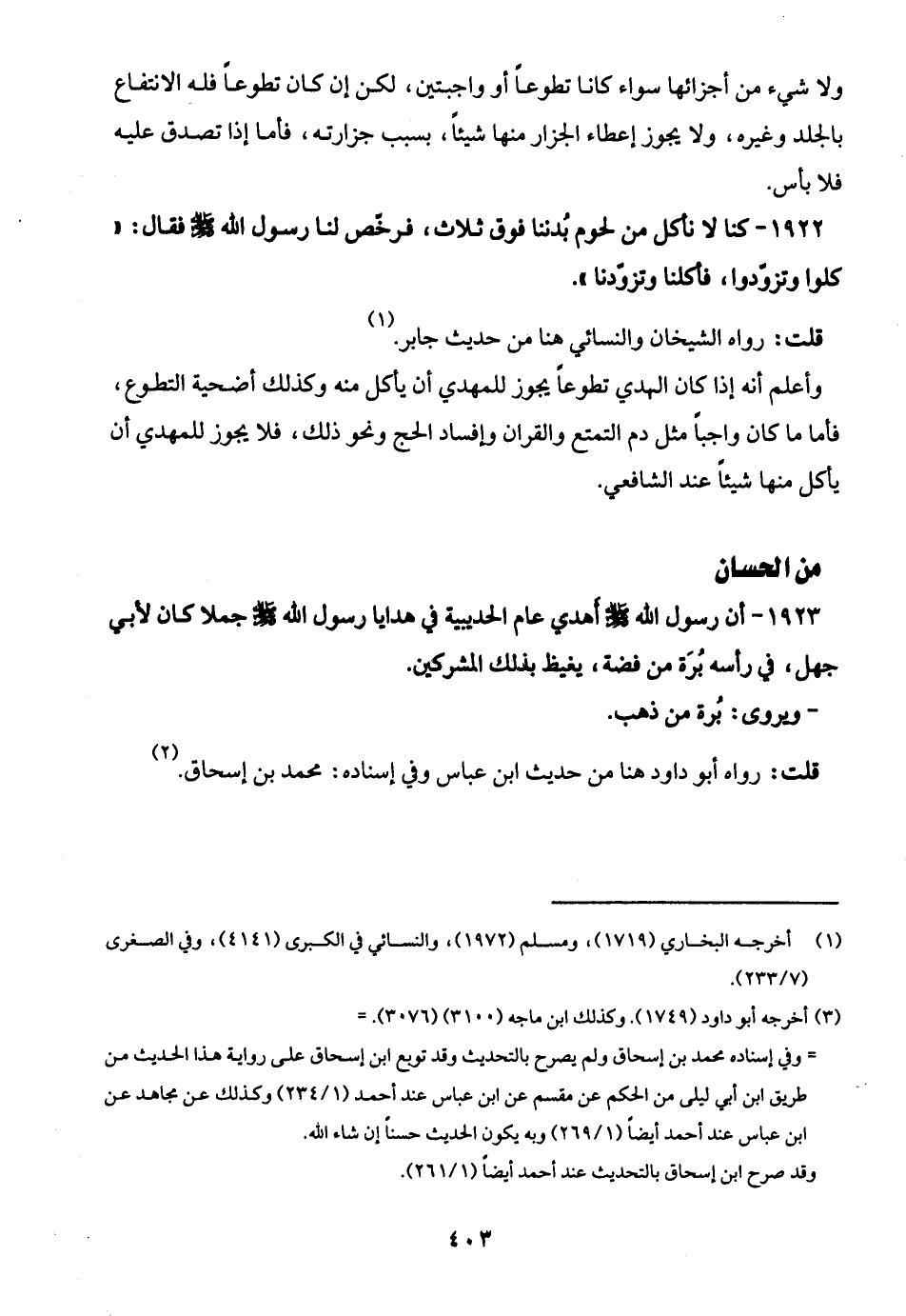 1922 - كنا لا نأكل من لحوم بُدننا فوق ثلاث، فرخّص لنا رسول الله - صلى الله عليه وسلم - فقال: "كلوا وتزوّدوا، فأكلنا وتزوّدنا".