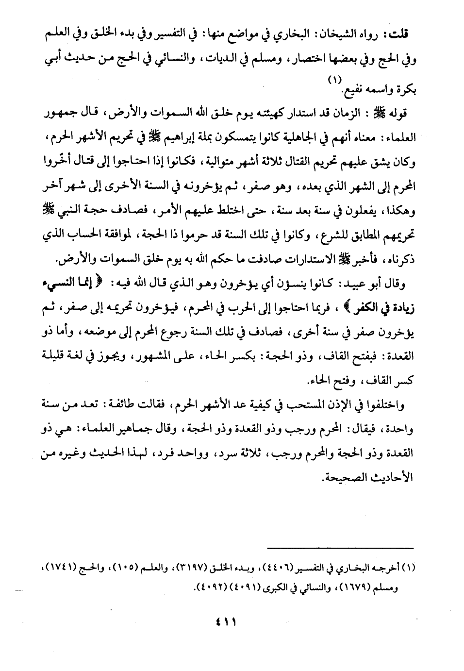 قوله - صلى الله عليه وسلم -: الزمان قد استدار كهيئته يوم خلق الله السموات والأرض، قال جمهور العلماء: معناه أنهم في الجاهلية كانوا يتمسكون بملة إبراهيم - صلى الله عليه وسلم - في تحريم الأشهر الحرم، وكان يشق عليهم تحريم القتال ثلاثة أشهر متوالية، فكانوا إذا احتاجوا إلى قتال أخّروا المحرم إلى الشهر الذي بعده، وهو صفر، ثمَّ يؤخرونه في السنة الأخرى إلى شهر آخر وهكذا، يفعلون في سنة بعد سنة، حتى اختلط عليهم الأمر، فصادف حجة النبي -صلى الله عليه وسلم- تحريمهم المطابق للشرع، وكانوا في تلك السنة قد حرموا ذا الحجة، لموافقة الحساب الذي ذكرناه، فأخبر - صلى الله عليه وسلم - الاستدارات صادفت ما حكم الله به يوم خلق السموات والأرض.
