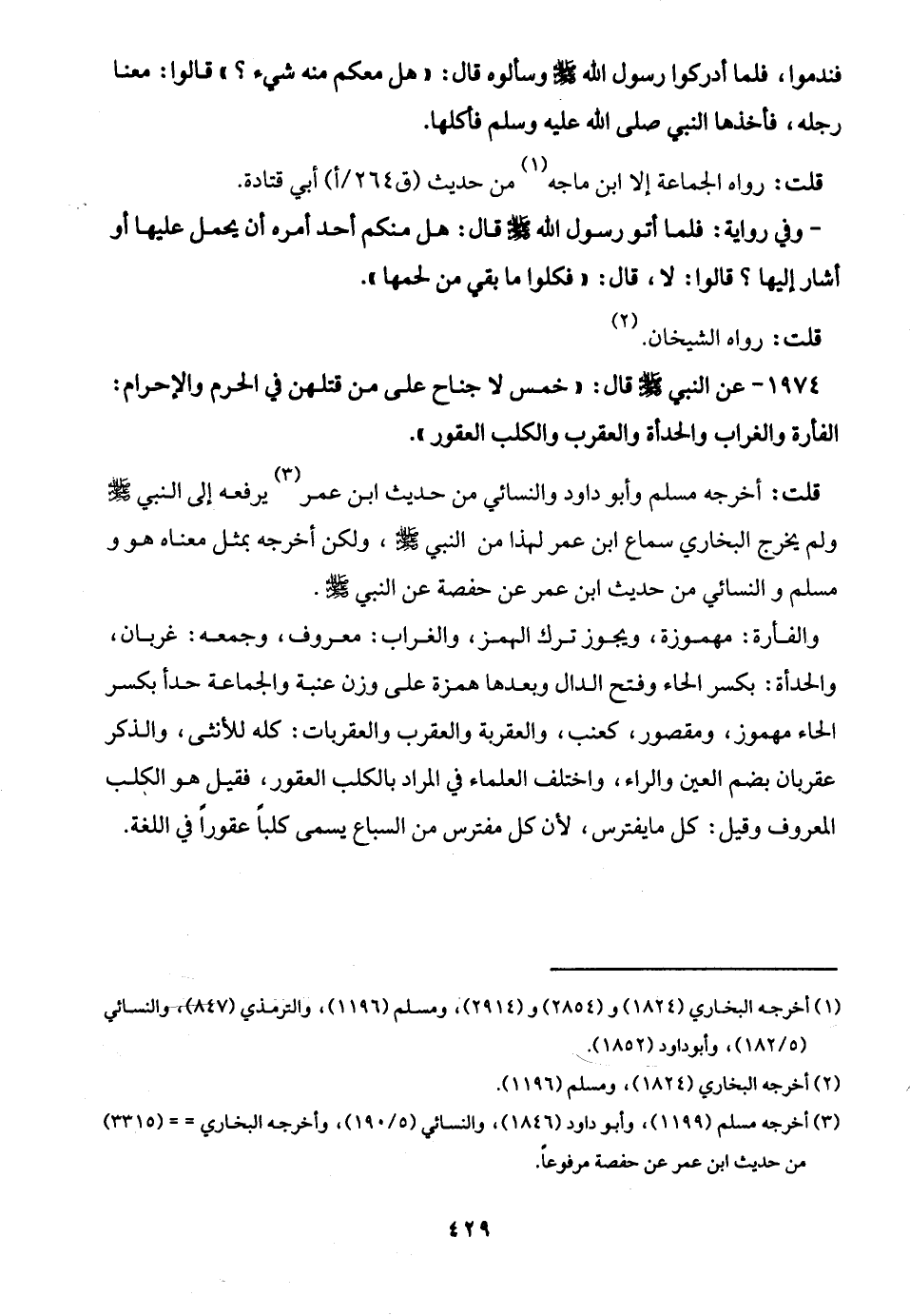 1974 - عن النبي -صلى الله عليه وسلم- قال: "خمس لا جناح على من قتلهن في الحرم والإحرام: الفأرة والغراب والحدأة والعقرب والكلب العقور".
