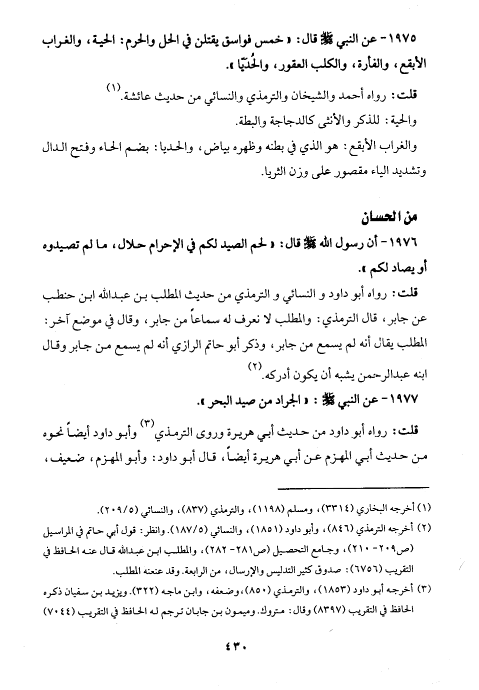 1976 - أن رسول الله -صلى الله عليه وسلم- قال: "لحم الصيد لكم في الإحرام حلال، ما لم تصيدوه أو يصاد لكم".