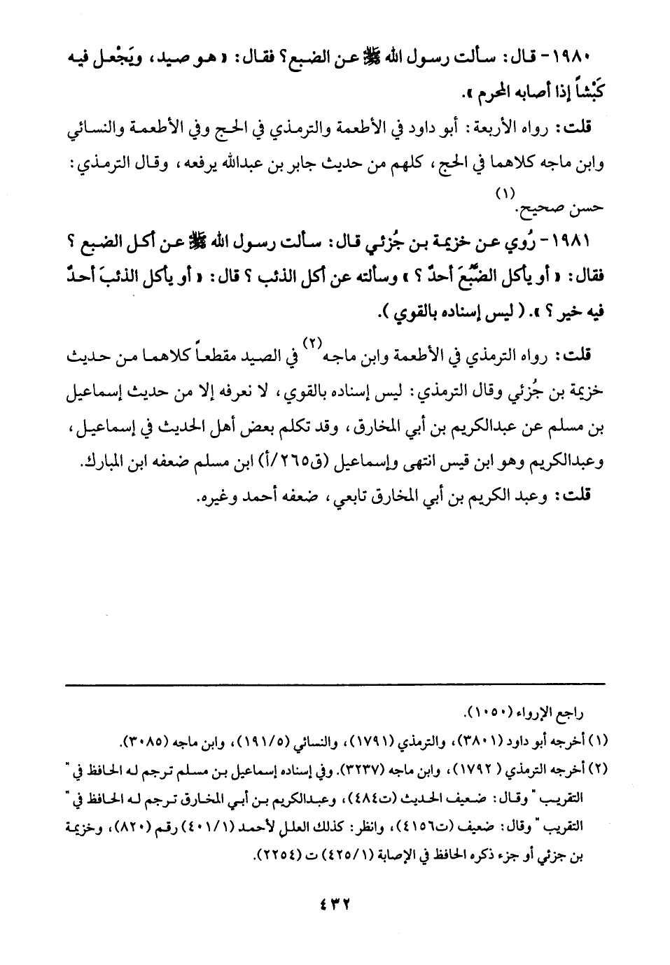 1981 - رُوي عن خزيمة بن جُزئي قال: سألت رسول الله -صلى الله عليه وسلم- عن أكل الضبع؟ فقال: "أو يأكل الضَّبُعَ أحدٌ؟ " وسألته عن أكل الذئب؟ قال: "أو يأكل الذئبَ أحدٌ فيه خير؟ ". (ليس إسناده بالقوي).