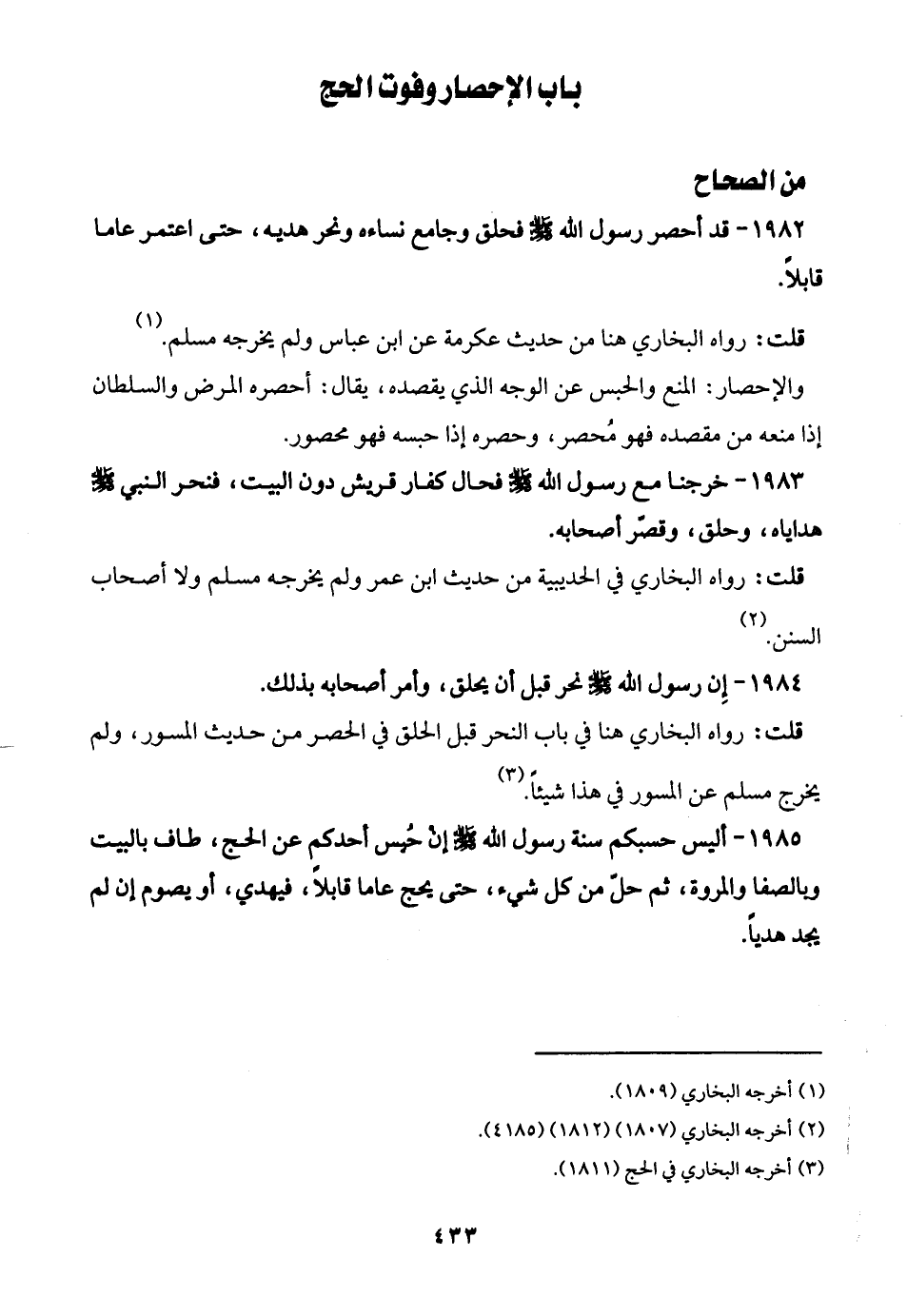 1985 - أليس حسبكم سنة رسول الله -صلى الله عليه وسلم- إنْ حُبِس أحدكم عن الحج، طاف بالبيت وبالصفا والمروة، ثم حلّ من كل شيء، حتى يحج عامًا قابلًا، فيهدي، أو يصوم إن لم يجد هديًا.