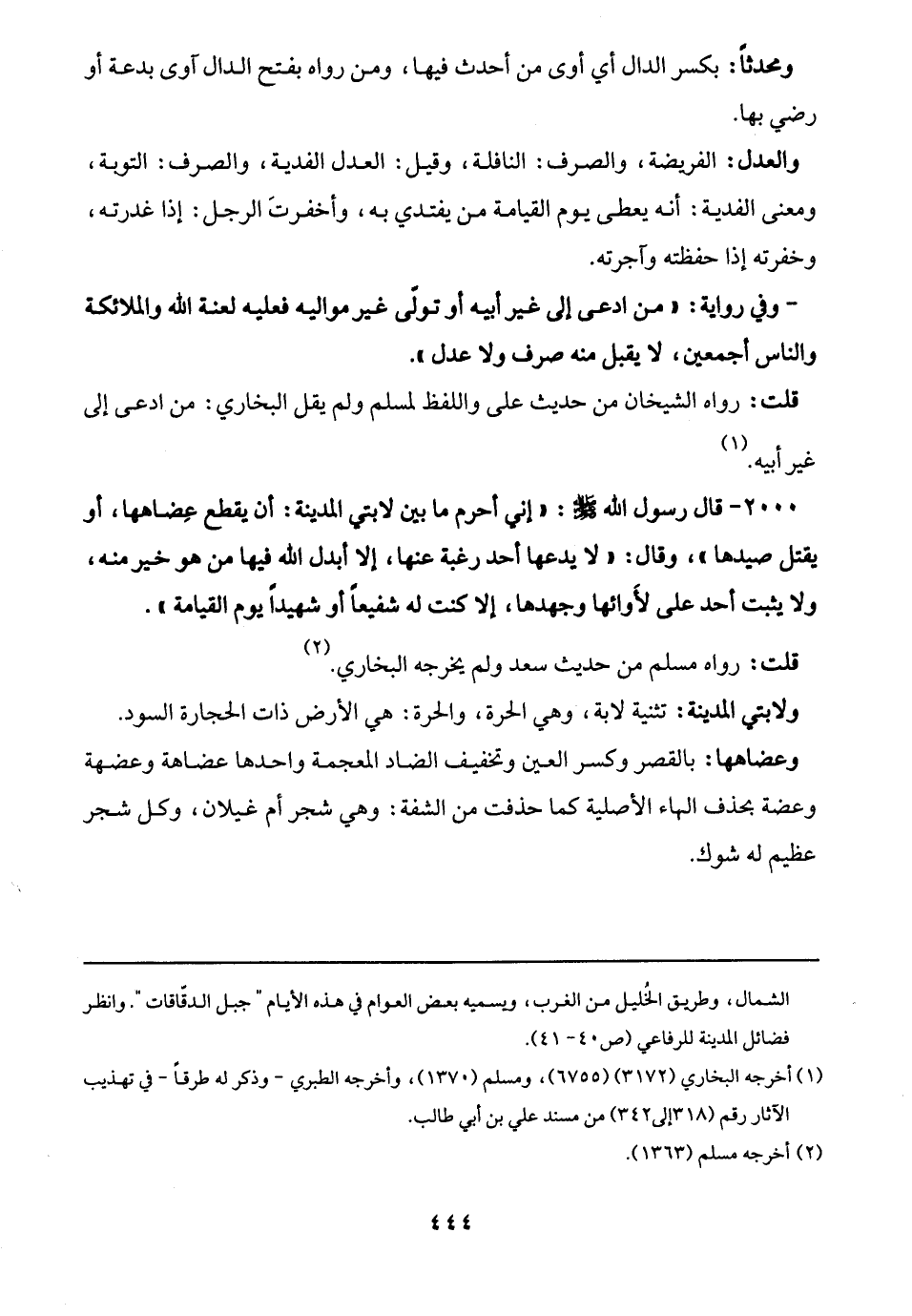 - وفي رواية: "من ادعى إلى غير أبيه أو تولّى غير مواليه فعليه لعنة الله والملائكة والناس أجمعين، لا يقبل منه صرف ولا عدل".
