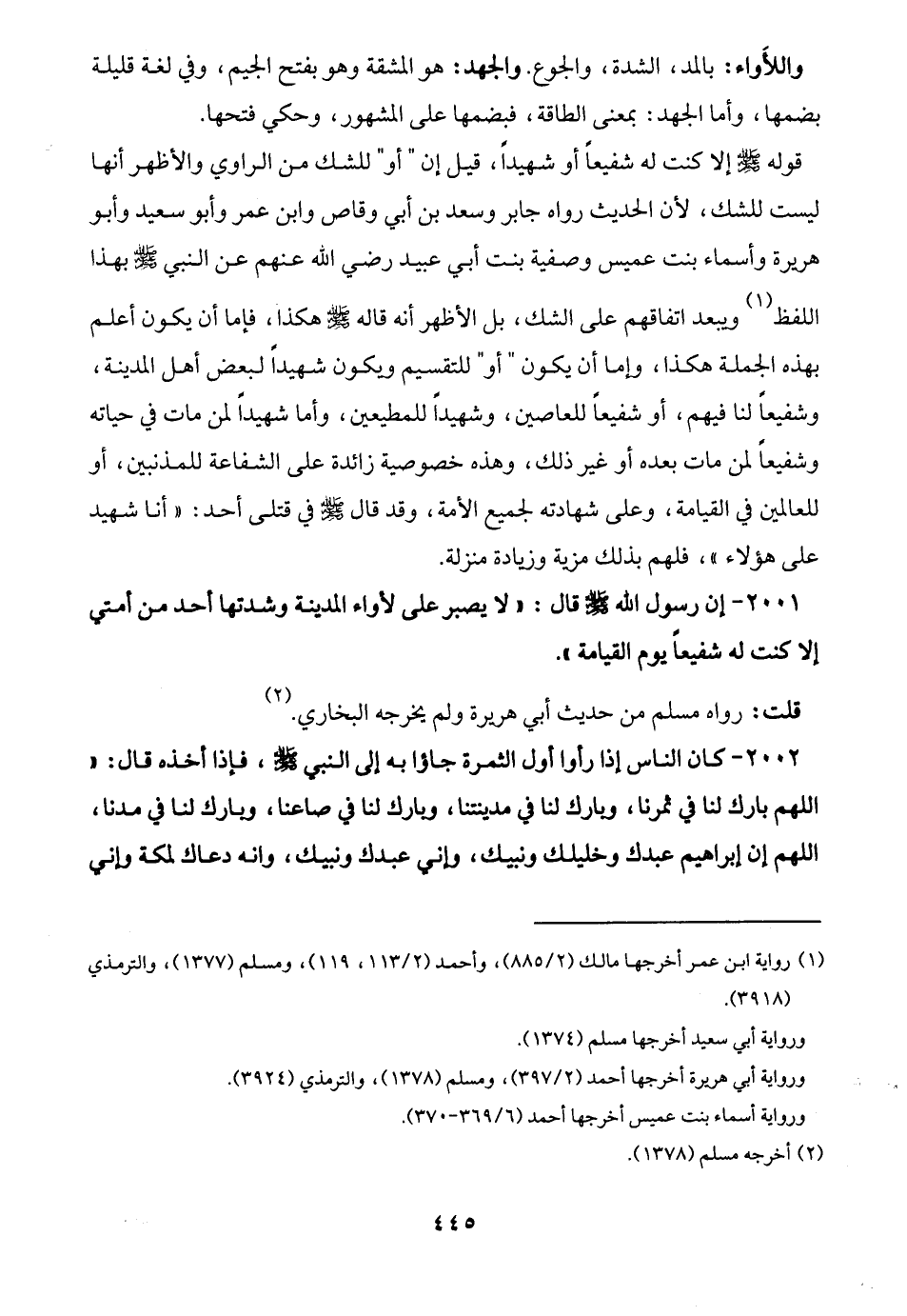 2001 - إن رسول الله -صلى الله عليه وسلم- قال: "لا يصبر على لأواء المدينة وشدتها أحد من أمتي إلا كنت له شفيعًا يوم القيامة".