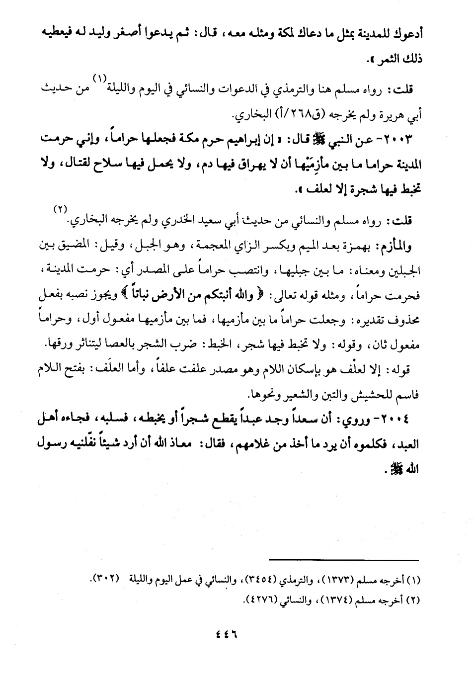 2003 - عن النبي -صلى الله عليه وسلم- قال: "إن إبراهيم حرم مكة فجعلها حرامًا، وإني حرمت المدينة حراما ما بين مأزِمَيْها أن لا يهراق فيها دم، ولا يحمل فيها سلاح لقتال، ولا تخبط فيها شجرة إلا لعلف".