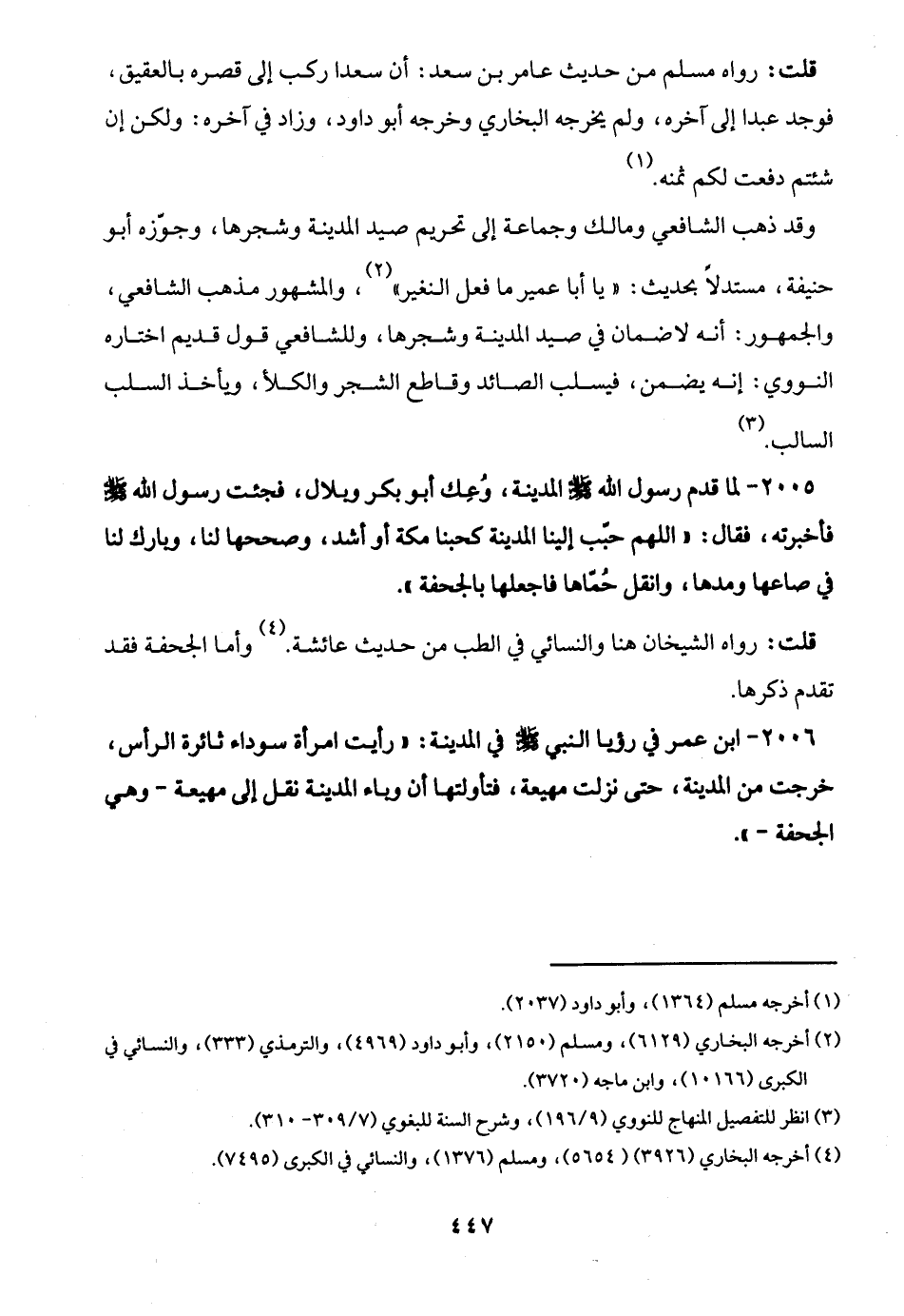 وقد ذهب الشافعي ومالك وجماعة إلى تحريم صيد المدينة وشجرها، وجوّزه أبو حنيفة، مستدلًا بحديث: "يا أبا عمير ما فعل النغير" (¬2)، والمشهور مذهب الشافعي، والجمهور: أنَّه لا ضمان في صيد المدينة وشجرها، وللشافعي قول قديم اختاره النوويّ: إنه يضمن، فيسلب الصائد وقاطع الشجر والكلأ، ويأخذ السلب السالب. (¬3)