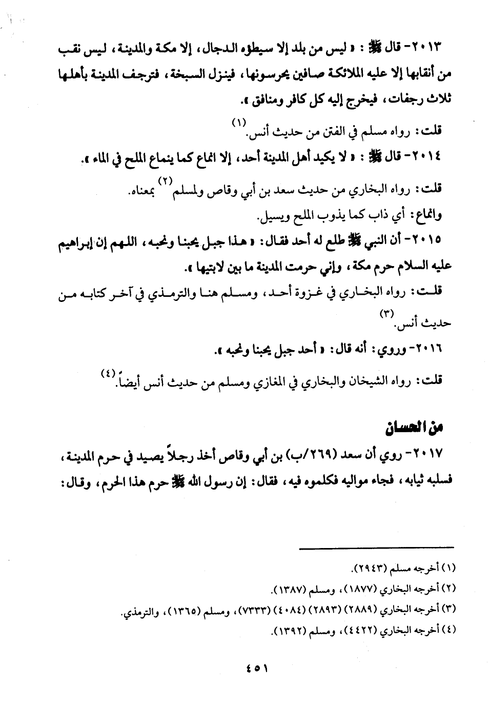 2015 - أن النبي -صلى الله عليه وسلم- طلع له أحد فقال: "هذا جبل يحبنا ونحبه، اللهم إن إبراهيم عليه السلام حرم مكة، وإني حرمت المدينة ما بين لابتيها".