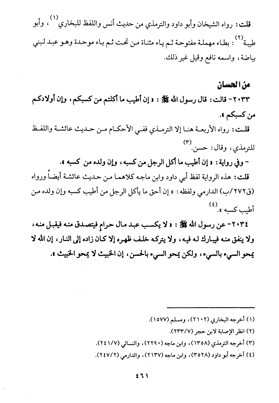 2034 - عن رسول الله -صلى الله عليه وسلم-: "لا يكسب عبد مال حرام فيتصدق منه فيقبل منه، ولا ينفق منه فيبارك له فيه، ولا يتركه خلف ظهره إلا كان زاده إلى النار، إن الله لا يمحو السيء بالسيء، ولكن يمحو السيء بالحسن، إن الخبيث لا يمحو الخبيث".