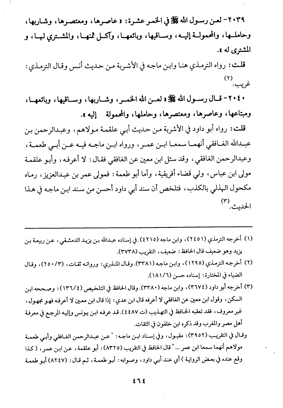 قلت: رواه أبو داود في الأشربة من حديث أبي علقمة مولاهم، وعبد الرحمن بن عبد الله الغافقي أنهما سمعا ابن عمر، ورواه ابن ماجه فيه عن أبي طعمة، وعبد الرحمن الغافقي، وقد سئل ابن معين عن الغافقي فقال: لا أعرفه، وأبو علقمة مولى ابن عباس، ولي قضاء أفريقية، وأما أبو طعمة: فمولى عمر بن عبد العزيز، رماه مكحول الهذلي بالكذب، فتلخص أن سند أبي داود أحسن من سند ابن ماجه في هذا الحديث. (¬3)