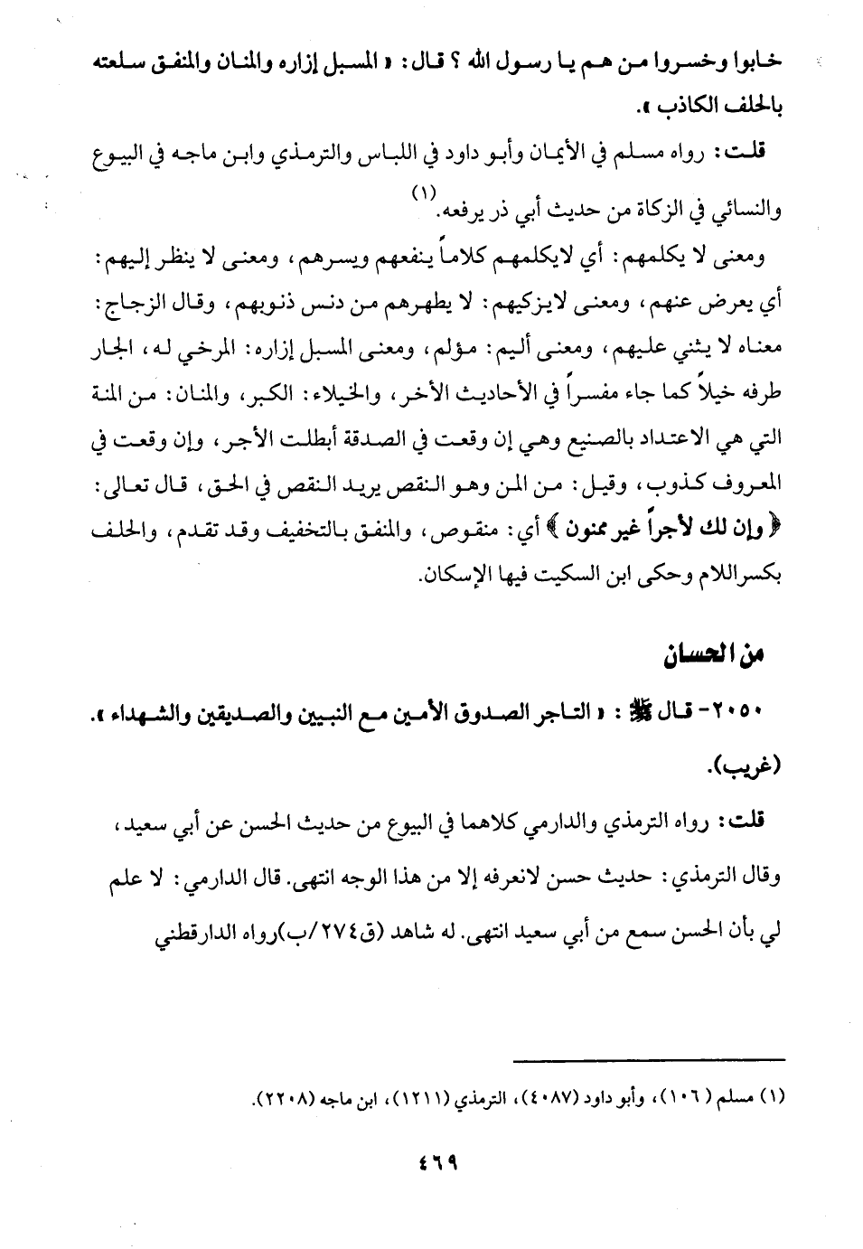 قلت: رواه مسلم في الأيمان وأبو داود في اللباس والترمذي وابن ماجه في البيوع والنسائيُّ في الزكاة من حديث أبي ذر يرفعه. (¬1)