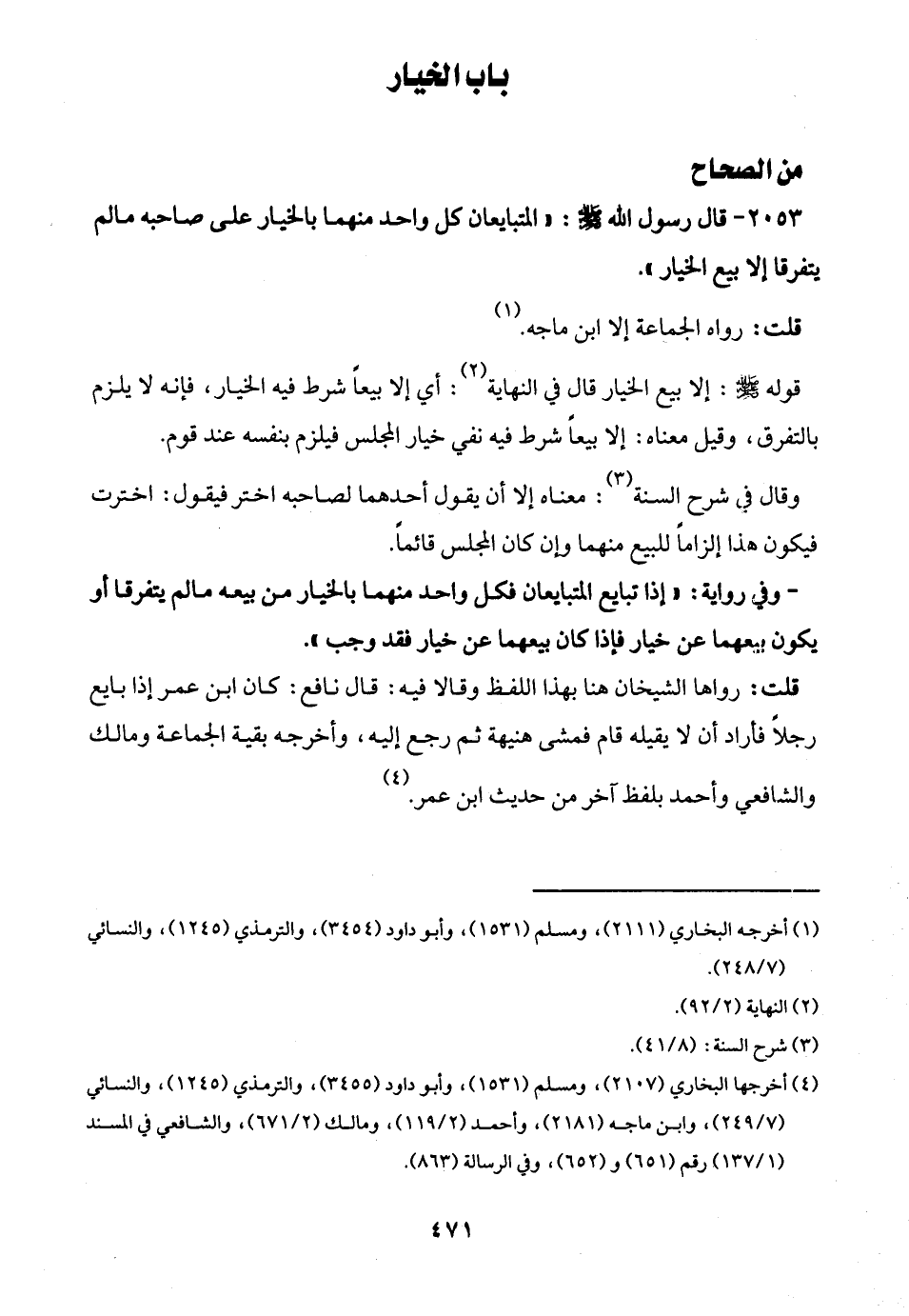 قلت: رواها الشيخان هنا بهذا اللفظ وقالا فيه: قال نافع: كان ابن عمر إذا بايع رجلًا فأراد أن لا يقيله قام فمشى هنيهة ثمَّ رجع إليه، وأخرجه بقية الجماعة ومالك والشافعيُّ وأحمد بلفظ آخر من حديث ابن عمر. (¬4)