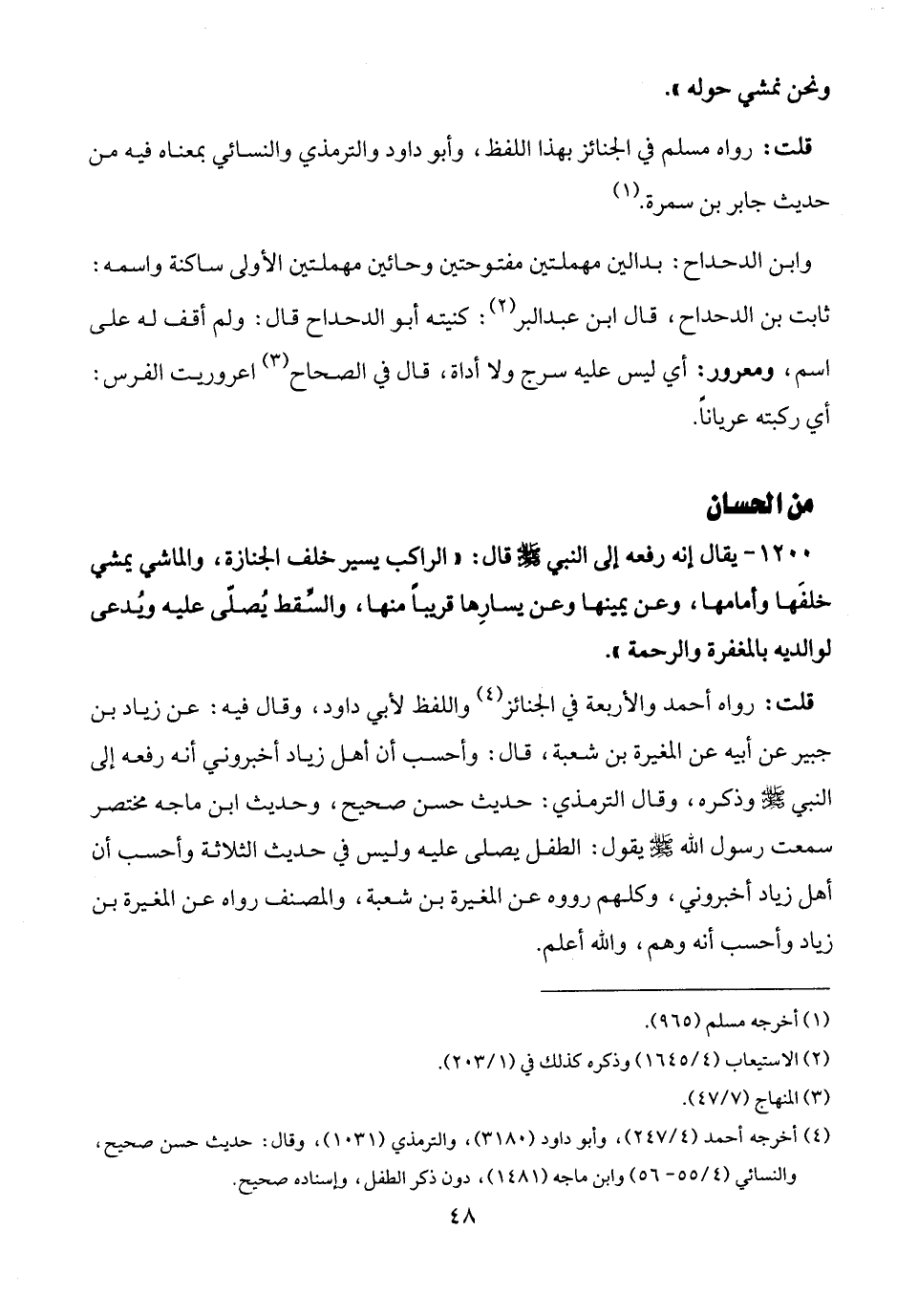 1200 - يقال إنه رفعه إلى النبي - صلى الله عليه وسلم - قال: "الراكب يسير خلف الجنازة، والماشي يمشي خلفَها وأمامها، وعن يمينها وعن يسارِها قريبًا منها، والسِّقط يُصلّى عليه ويُدعى لوالديه بالمغفرة والرحمة".