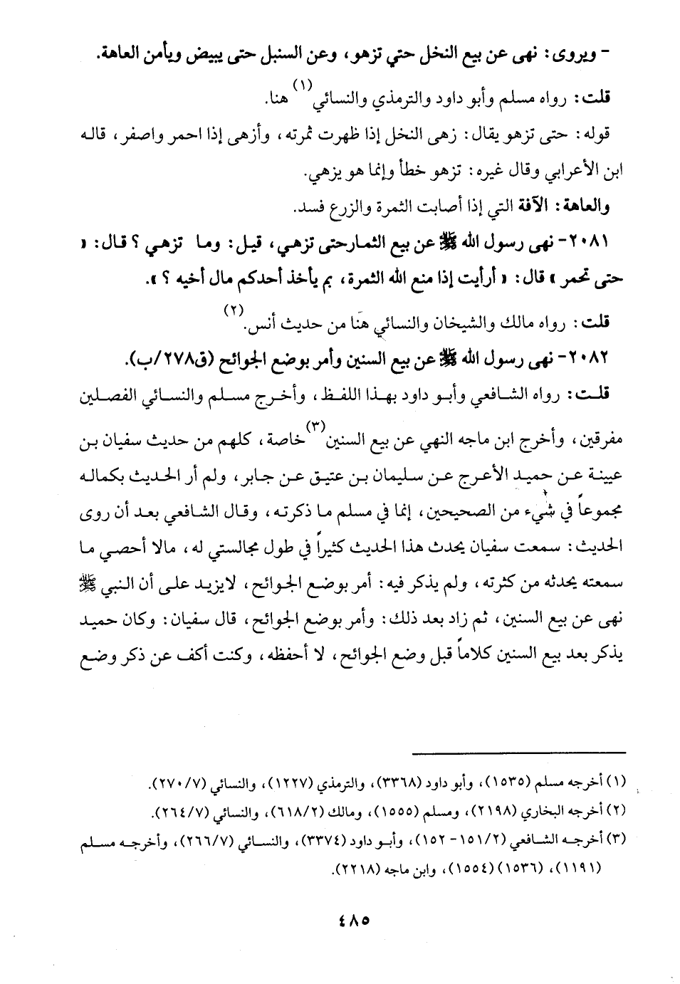 قلت: رواه الشافعي وأبو داود بهذا اللفظ، وأخرج مسلم والنسائيُّ الفصلين مفرقين، وأخرج ابن ماجه النهي عن بيع السنين (¬3) خاصة، كلهم من حديث سفيان بن عيينة عن حميد الأعرج عن سليمان بن عتيق عن جابر، ولم أر الحديث بكماله مجموعًا في شيء من الصحيحين، إنما في مسلم ما ذكرته، وقال الشافعي بعد أن روى الحديث: سمعت سفيان يحدث هذا الحديث كثيرًا في طول مجالستي له، ما لا أحصي ما سمعته يحدثه من كثرته، ولم يذكر فيه: أمر بوضع الجوائح، لا يزيد على أن النبي -صلى الله عليه وسلم- نهى عن بيع السنين، ثم زاد بعد ذلك: وأمر بوضع الجوائح، قال سفيان: وكان حميد يذكر بعد بيع السنين كلامًا قبل وضع الجوائح، لا أحفظه، وكنت أكف عن ذكر وضع