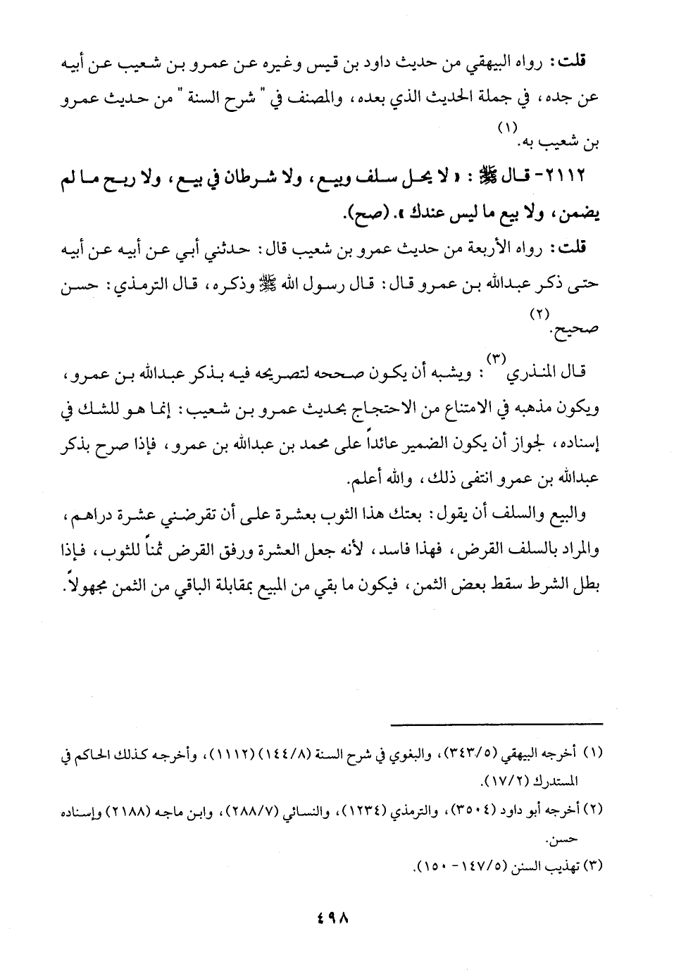 2112 - قال - صلى الله عليه وسلم -: "لا يحل سلف وبيع، ولا شرطان في بيع، ولا ريح ما لم يضمن، ولا بيع ما ليس عندك". (صح).