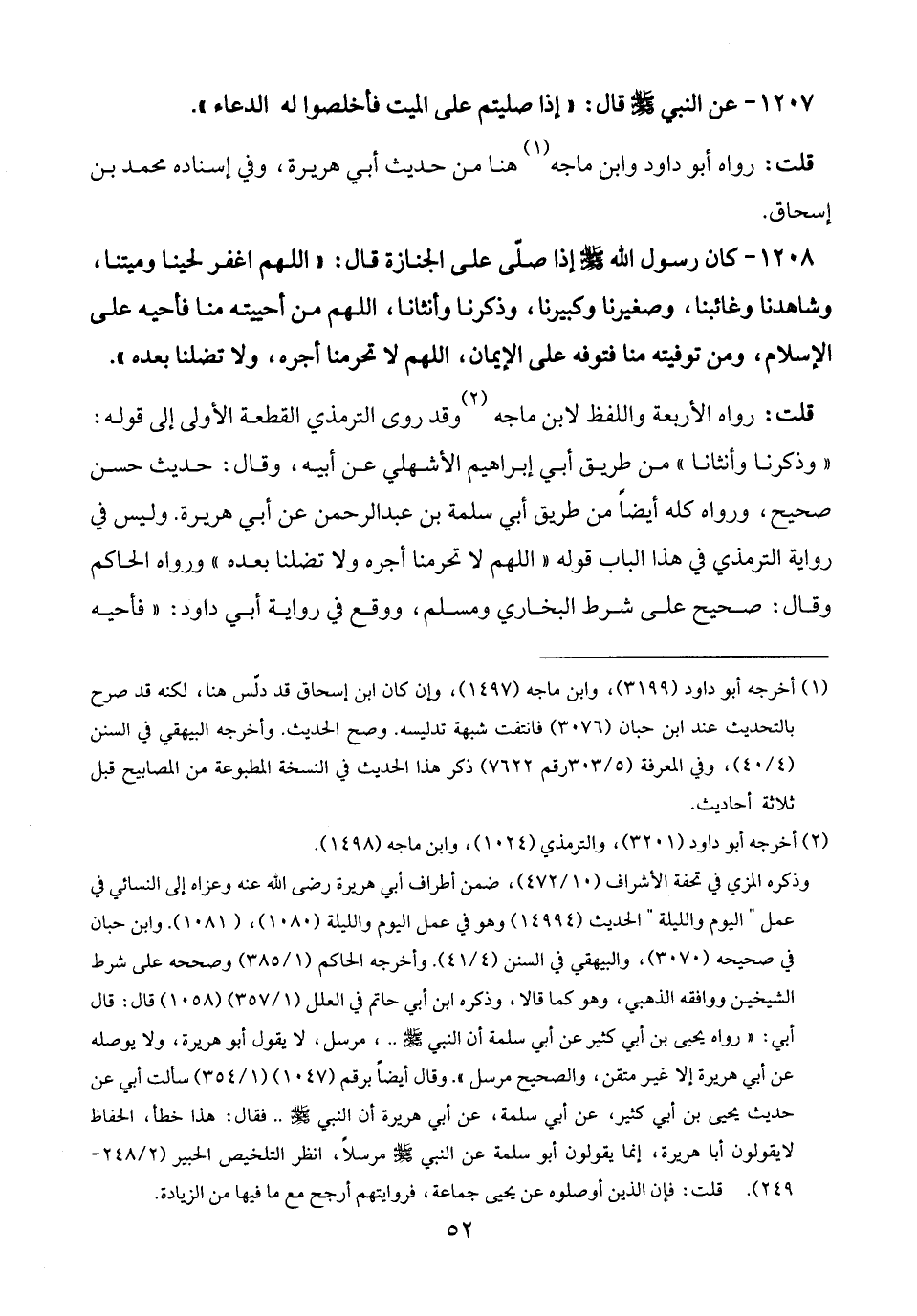 1208 - كان رسول الله - صلى الله عليه وسلم - إذا صلّى على الجنازة قال: "اللهم اغفر لحينا وميتنا، وشاهدنا وغائبنا، وصغيرنا وكبيرنا، وذكرنا وأنثانا، اللهم من أحييته منا فأحيه على الإسلام، ومن توفيته منا فتوفه على الإيمان، اللهم لا تحرمنا أجره، ولا تضلنا بعده".