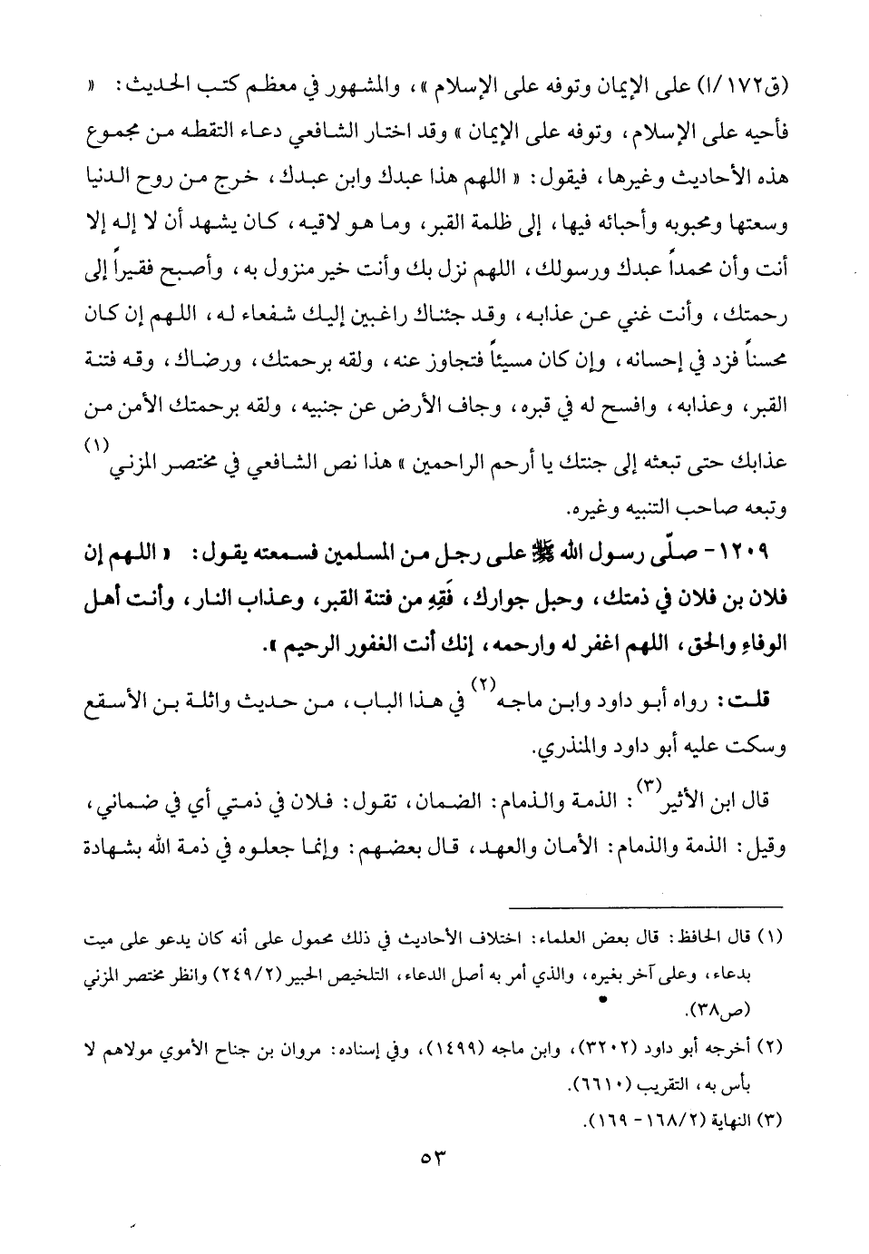 1209 - صلّى رسول الله - صلى الله عليه وسلم - على رجل من المسلمين فسمعته يقول: "اللهم إن فلان بن فلان في ذمتك، وحبل جوارك، فَقِهِ من فتنة القبر، وعذاب النار، وأنت أهل الوفاءِ والحق، اللهم اغفر له وارحمه، إنك أنت الغفور الرحيم".