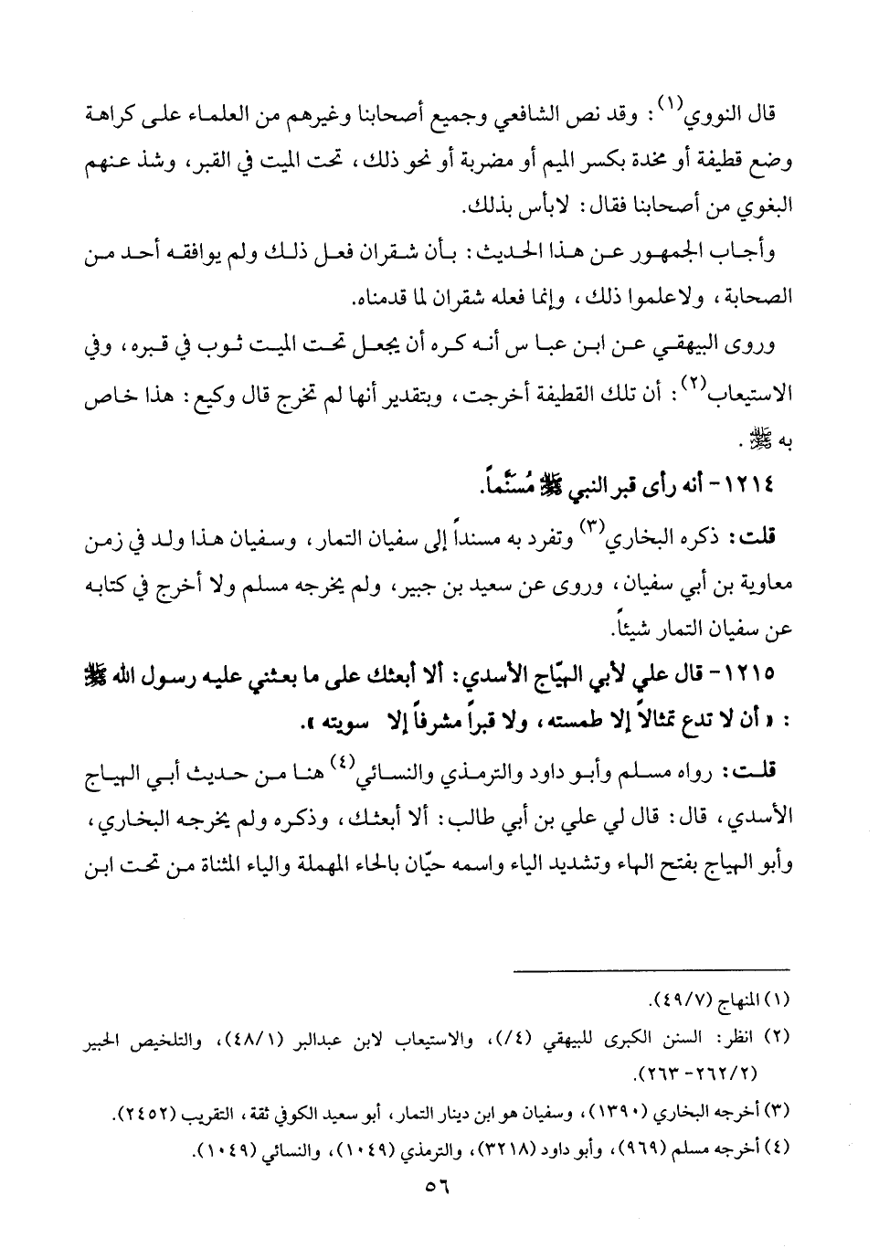 1215 - قال علي لأبي الهيّاج الأسدي: ألا أبعثك على ما بعثني عليه رسول الله - صلى الله عليه وسلم -: "أن لا تدع تمثالًا إلا طمسته، ولا قبرًا مشرفًا إلا سويته".