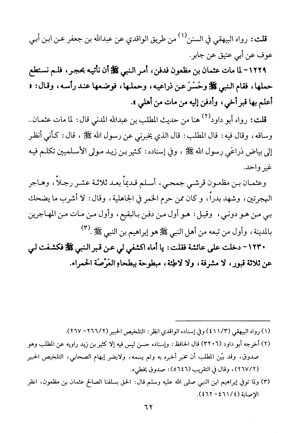 1230 - دخلت على عائشة فقلت: يا أماه اكشفي لي عن قبر النبي - صلى الله عليه وسلم - فكشفت لي عن ثلاثة قبور، لا مشرفة، ولا لاطِئة، مبطوحة ببطحاءِ العَرْصَة الحمراء.