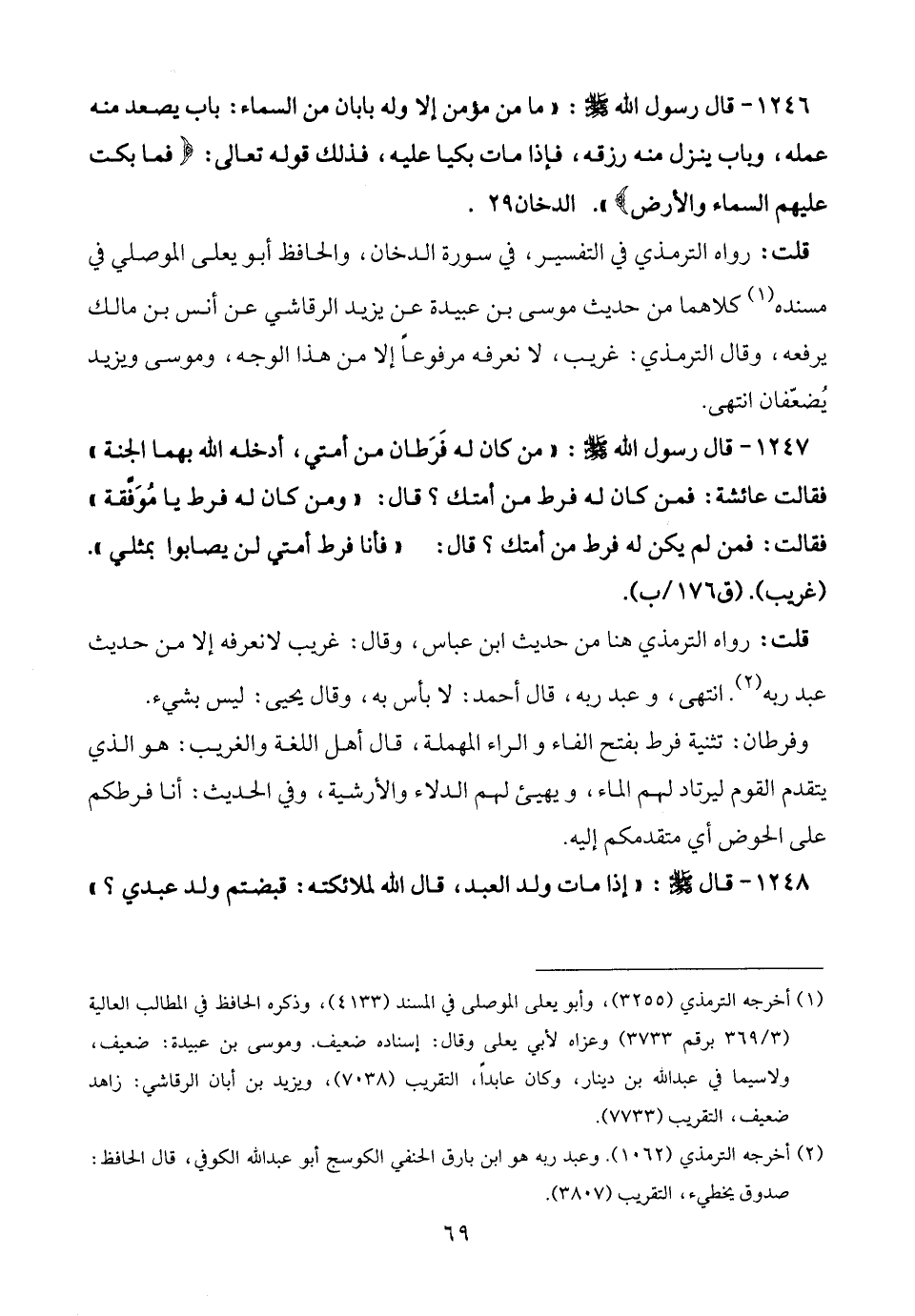 1247 - قال رسول الله - صلى الله عليه وسلم -: "من كان له فَرَطان من أمتي، أدخله الله بهما الجنة" فقالت عائشة: فمن كان له فرط من أمتك؟ قال: "ومن كان له فرط يا مُوَفَّقة" فقالت: فمن لم يكن له فرط من أمتك؟ قال: "فأنا فرط أمتي لن يصابوا بمثلي". (غريب).