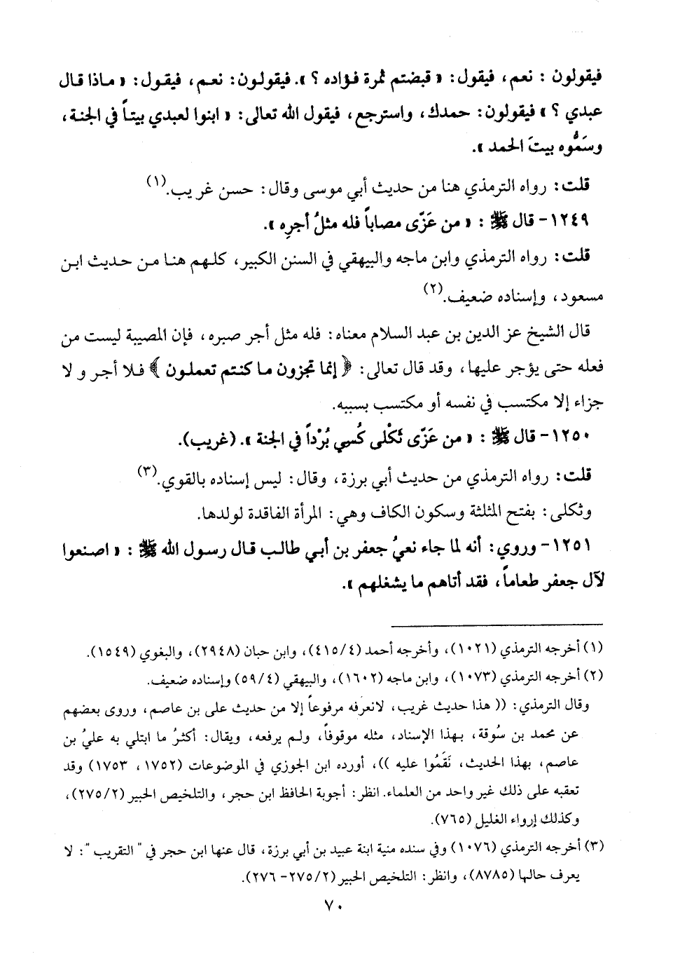 1250 - قال - صلى الله عليه وسلم -: "من عَزّى ثَكْلى كُسِي بُرْدًا في الجنة". (غريب).