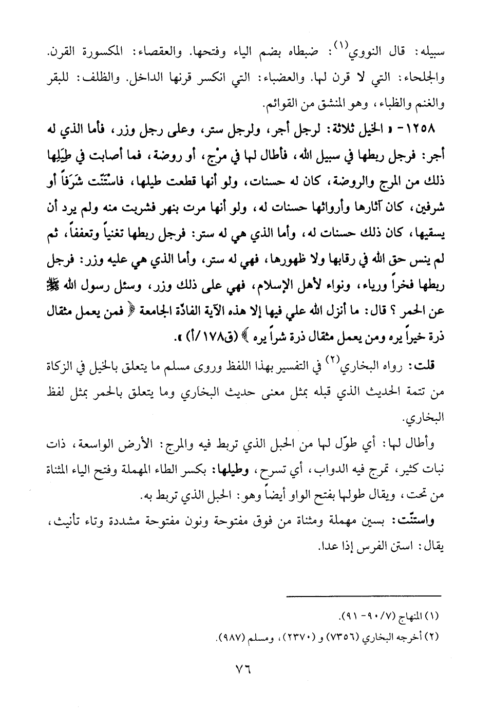 1258 - "الخيل ثلاثة: لرجل أجر، ولرجل ستر، وعلى رجل وزر، فأما الذي له أجر: فرجل ربطها في سبيل الله، فأطال لها في مرْج، أو روضة، فما أصابت في طِيَلِها ذلك من المرج والروضة، كان له حسنات، ولو أنها قطعت طيلها، فاسْتَنّت شَرَفًا أو شرفين، كان آثارها وأرواثها حسنات له، ولو أنها مرت بنهر فشربت منه ولم يرد أن يسقيها، كان ذلك حسنات له، وأما الذي هي له ستر: فرجل ربطها تغنيًّا وتعففًا، ثم لم ينس حق الله في رقابها ولا ظهورها، فهي له ستر، وأما الذي هي عليه وزر: فرجل ربطها فخرًا ورياء، ونواء لأهل الإسلام، فهي على ذلك وزر، وسئل رسول الله - صلى الله عليه وسلم - عن الحمر؟ قال: ما أنزل الله علي فيها إلا هذه الآية الفاذّة الجامعة {فمن يعمل مثقال ذرة خيرًا يره ومن يعمل مثقال ذرة شرًّا يره} ".