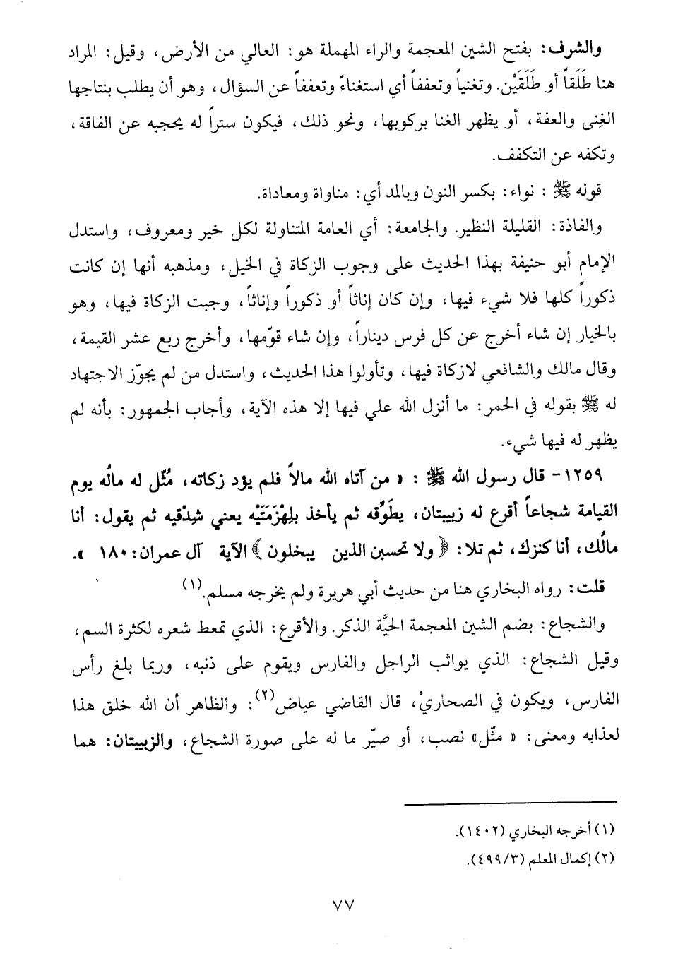 1259 - قال رسول الله - صلى الله عليه وسلم -: "من آتاه الله مالًا فلم يؤد زكاته، مُثّل له مالُه يوم القيامة شجاعًا أقرع له زبيبتان، يطَوِّقه ثم يأخذ بلِهْزَمَتَيْه يعني شِدْقيه ثم يقول: أنا مالُك، أنا كنزك، ثم تلا: {وَلَا يَحْسَبَنَّ الَّذِينَ يَبْخَلُونَ} الآية آل عمران: 180".