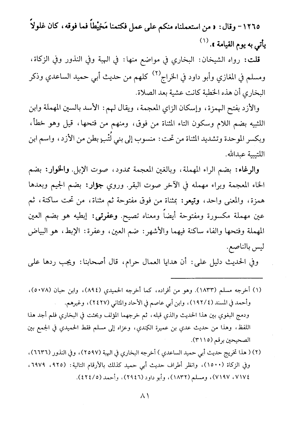 (¬2) (هذا تخريج حديث أبي حميد الساعدي) أخرجه البخاري في الهبة (2597)، وفي النذور (6636)، وفي الزكاة (1500)، وانظر أطراف حديث أبي حميد كذلك بالأرقام التالية: (925، 6979، 7174، 7197)، ومسلم (1832)، وأبو داود (2946) , وأحمد (5/ 424).