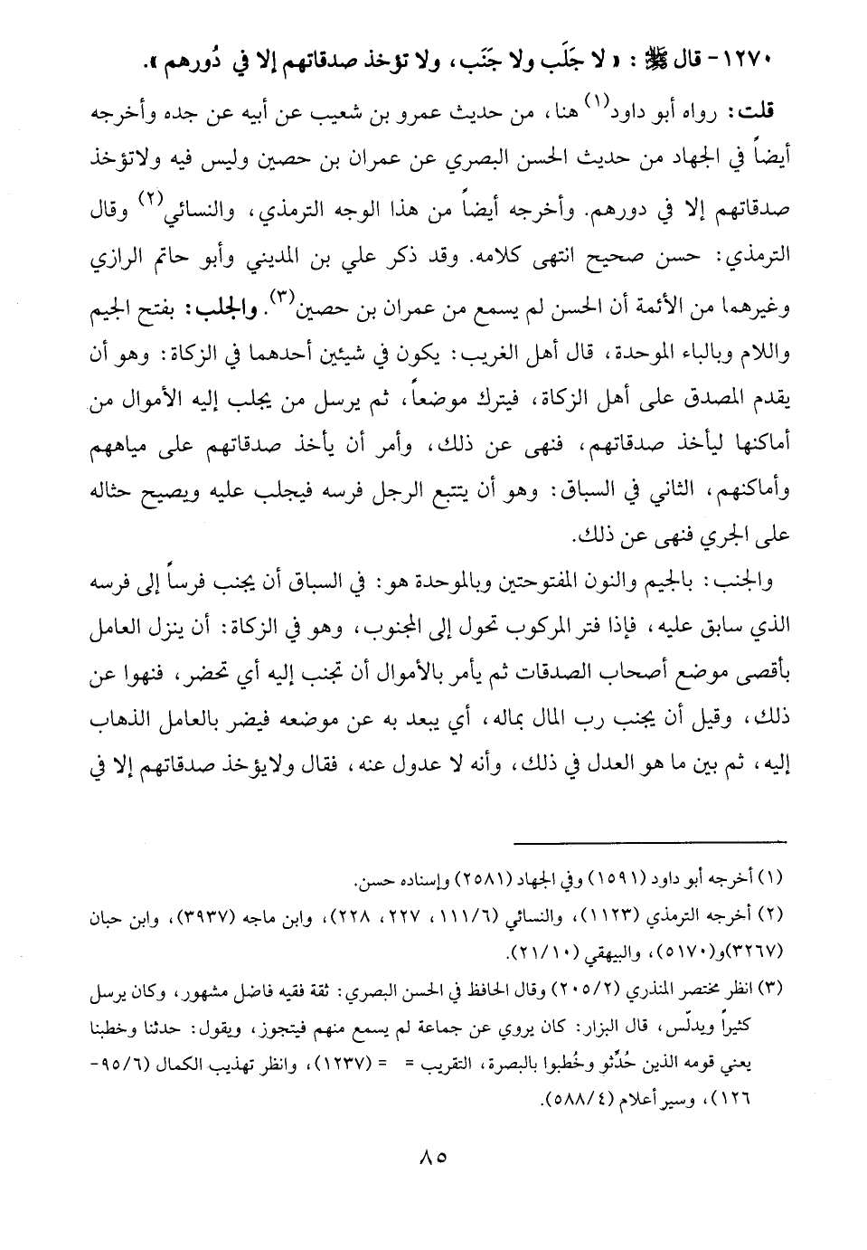 1270 - قال - صلى الله عليه وسلم -: "لا جَلَب ولا جَنَب، ولا تؤخذ صدقاتهم إلا في دُورهم".