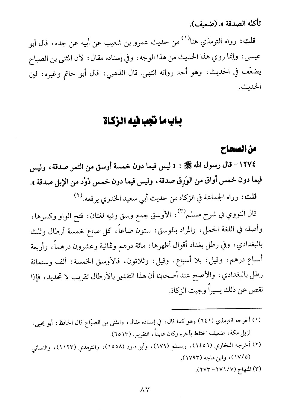 1274 - قاله رسول الله - صلى الله عليه وسلم -: "ليس فيما دون خمسة أوسق من التمر صدقة، وليس فيما دون خمس أواق من الوَرِق صدقة، وليس فيما دون خمس ذَوْد من الإبل صدقة".