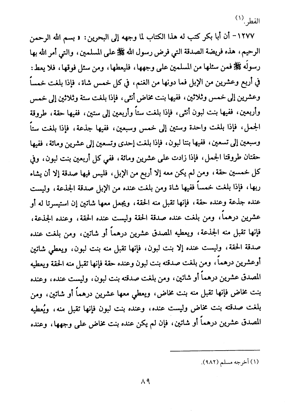 1277 - أن أبا بكر كتب له هذا الكتاب لما وجهه إلى البحرين: "بسم الله الرحمن الرحيم، هذه فريضة الصدقة التي فرض رسول الله - صلى الله عليه وسلم - على المسلمين، والتي أمر الله بها رسولَه - صلى الله عليه وسلم - فمن سئلها من المسلمين على وجهها، فليعطها، ومن سئل فوقها، فلا يعط: في أربع وعشرين من الإبل فما دونها من الغنم، في كل خمس شاة، فإذا بلغت خمسًا وعشرين إلى خمس وثلاثين، ففيها بنت مخاض أنثى، فإذا بلغت ستة وثلاثين إلى خمس وأربعين، ففيها بنت لبون أنثى، فإذا بلغت ستًّا وأربعين إلى ستين، ففيها حقة، طروقة الجمل، فإذا بلغت واحدة وستين إلى خمس وسبعين، ففيها جذعة، فإذا بلغت ستًّا وسبعين إلى تسعين، ففيها بنتا لبون، فإذا بلغت إحدى وتسعين إلى عشرين ومائة، ففيها حقتان طروقتا الجمل، فإذا زادت على عشرين ومائة، ففي كل أربعين بنت لبون، وفي كل خمسين حقة، ومن لم يكن معه إلا أربع من الإبل، فليس فيها صدقة إلا أن يشاء ربها، فإذا بلغت خمسًا ففيها شاة ومن بلغت عنده من الإبل صدقة الجذعة، وليست عنده جذعة وعنده حقة، فإنها تقبل منه الحقة، ويجعل معها شاتين إن استيسرتا له أو عشرين درهمًا، ومن بلغت عنده صدقة الحقة وليست عنده الحقة، وعنده الجذعة، فإنها تقبل منه الجذعة، ويعطيه المصدق عشرين درهمًا أو شاتين، ومن بلغت عنده صدقة الحقة، وليست عنده إلا بنت لبون، فإنها تقبل منه بنت لبون، ويعطي شاتين أو عشرين درهمًا، ومن بلغت صدقته بنت لبون وعنده حقة فإنها تقبل منه الحقة ويعطيه المصدق عشرين درهمًا أو شاتين، ومن بلغت صدقته بنت لبون، وليست عنده، وعنده بنت مخاض فإنها تقبل منه بنت مخاض، ويعطي معها عشرين درهمًا أو شاتين، ومن بلغت صدقته بنت مخاض وليست عنده، وعنده بنت لبون فإنها تقبل منه، ويُعطيه المصدق عشرين درهمًا أو شاتين، فإن لم يكن عنده بنت مخاض على وجهها، وعنده