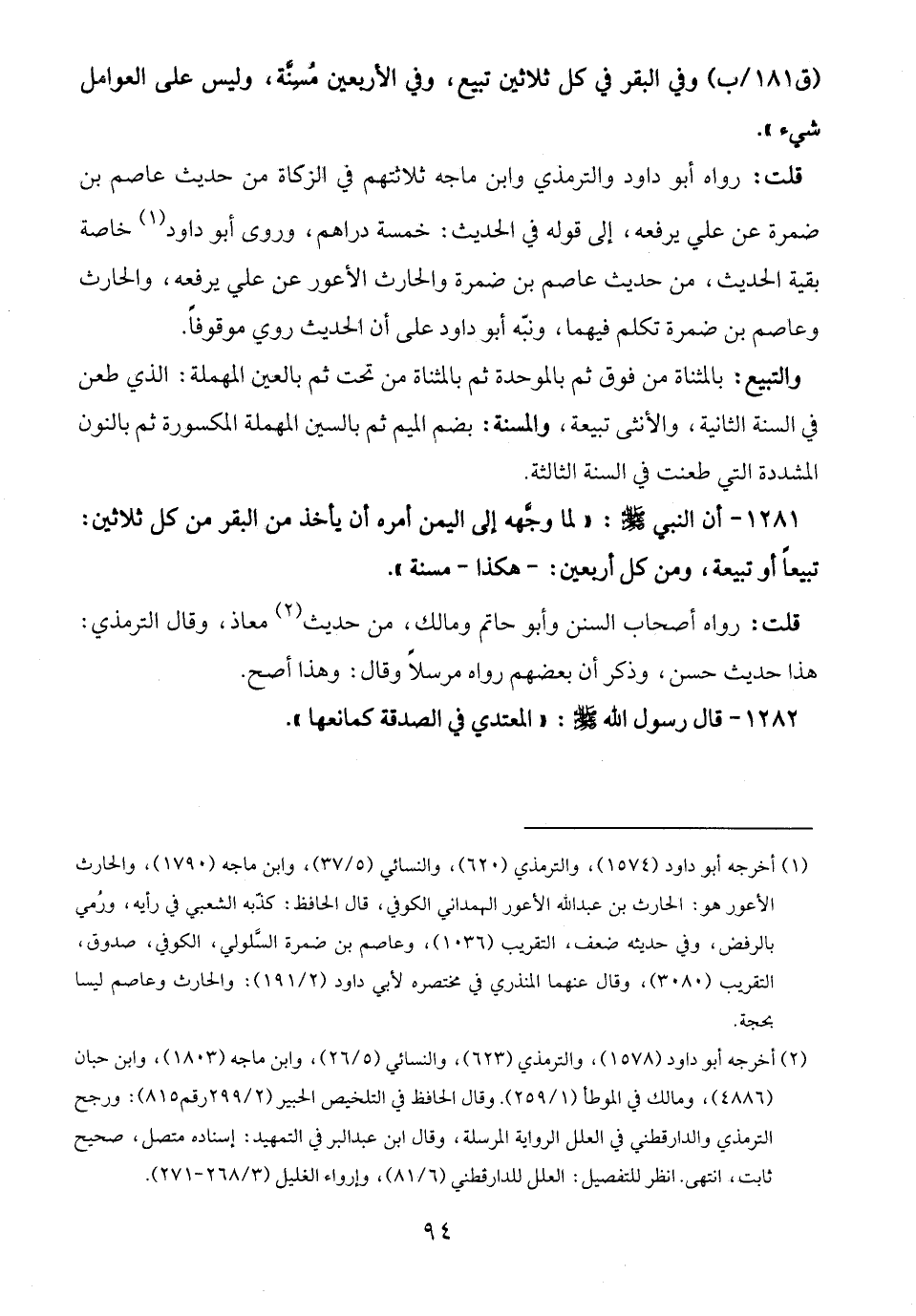 (¬1) أخرجه أبو داود (1574)، والترمذي (620)، والنسائي (5/ 37)، وابن ماجه (1790)، والحارث الأعور هو: الحارث بن عبد الله الأعور الهمداني الكوفي، قال الحافظ: كذّبه الشعبي في رأيه، ورُمي بالرفض، وفي حديثه ضعف، التقريب (1036)، وعاصم بن ضمرة السَّلولي، الكوفي، صدوق، التقريب (3080)، وقال عنهما المنذري في مختصره لأبي داود (2/ 191): والحارث وعاصم ليسا بحجة.