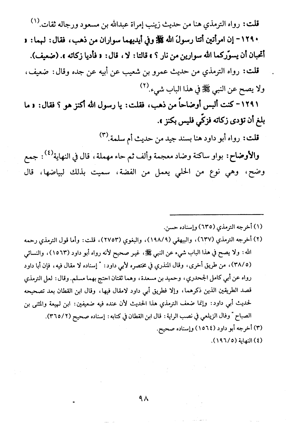 1291 - كنت ألبس أوضاحًا من ذهب، فقلت: يا رسول الله أكنز هو؟ فقال: "ما بلغ أن تؤدى زكاته فزكّي فليس بكنز".