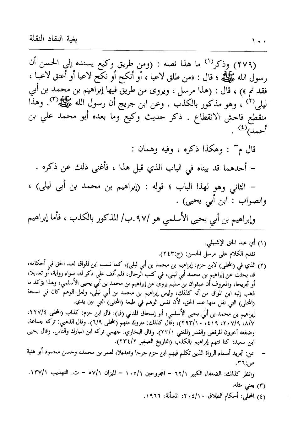 إبراهيم بن محمد بن أبي يحيى الأسلمي، أبو إسحاق المدني (ق): قال ابن حزم: كذاب (المحلى 4/ 227، 7/ 8، 9/ 207، 419، 10/ 293)، وقال كذلك: متروك متهم (المحلى 9/ 6). وقال الذهبي: تركه جماعة، (ضفعه آخرون للرفض والقدر (المغني 1/ 23). وقال البخاري: جهمي تركه ابن المبارك والناس. وقال يحيى ابن سعيد: كنا نتهم. إبراهيم بالكذب (التاريخ الصغير 2/ 234).