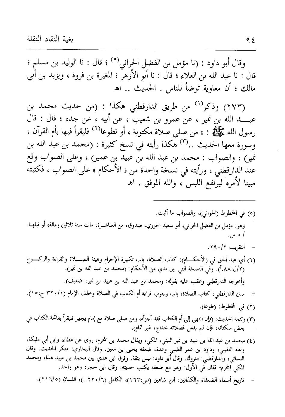 (273) وذكر (¬1) من طريق الدارقطني هكذا: (من حديث محمد بن عبد الله بن نمير، عن عمرو بن شعيب، عن أبيه، عن جده، قال: قال رسول الله - صلى الله عليه وسلم -: "من صلى صلاة مكتوبة، أو تطوعا (¬2) فليقرأ فيها بأم القرآن، وسورة معها الحديث .. (¬3) هكذا رأيته في نسخ كثيرة: (محمد بن عبد الله بن نمير) (¬4)، والصواب: محمد بن عبد الله بن عبيد بن عمير، وعلى الصواب وقع عند الدارقطني، ورأيته في نسخة واحدة من "الأحكام" على الصواب، فكتبته مبينا لأمره ليرتفع اللبس، والله الموفق. اهـ