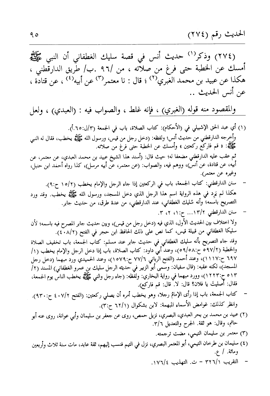 (274) وذكر (¬1) حديث أنس في قصة سليك الغطفاني أن النبي - صلى الله عليه وسلم - أمسك عن الخطبة حتى فرغ من صلاته، من / 96. ب/ طريق الدارقطني، هكذا عن عبيد بن محمد الغبري (¬2)؛ قال: نا معتمر (¬3) عن أبيه (¬4)، عن قتادة، عن أنس الحديث ..