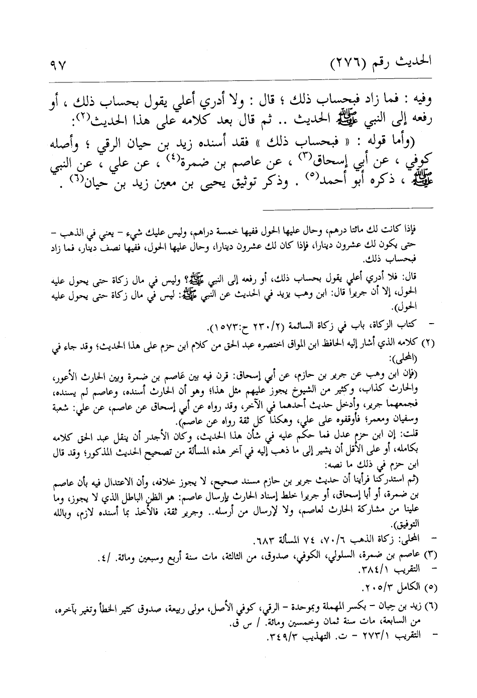 (وأما قوله: "فبحساب ذلك" فقد أسنده زيد بن حيان الرقي؛ وأصله كوفي، عن أبي إسحاق، عن عاصم بن ضمرة (¬3)، عن علي، عن النبي - صلى الله عليه وسلم -، ذكره أبو أحمد (¬5). وذكر توثيق يحيى بن معين زيد بن حبان (¬6).
