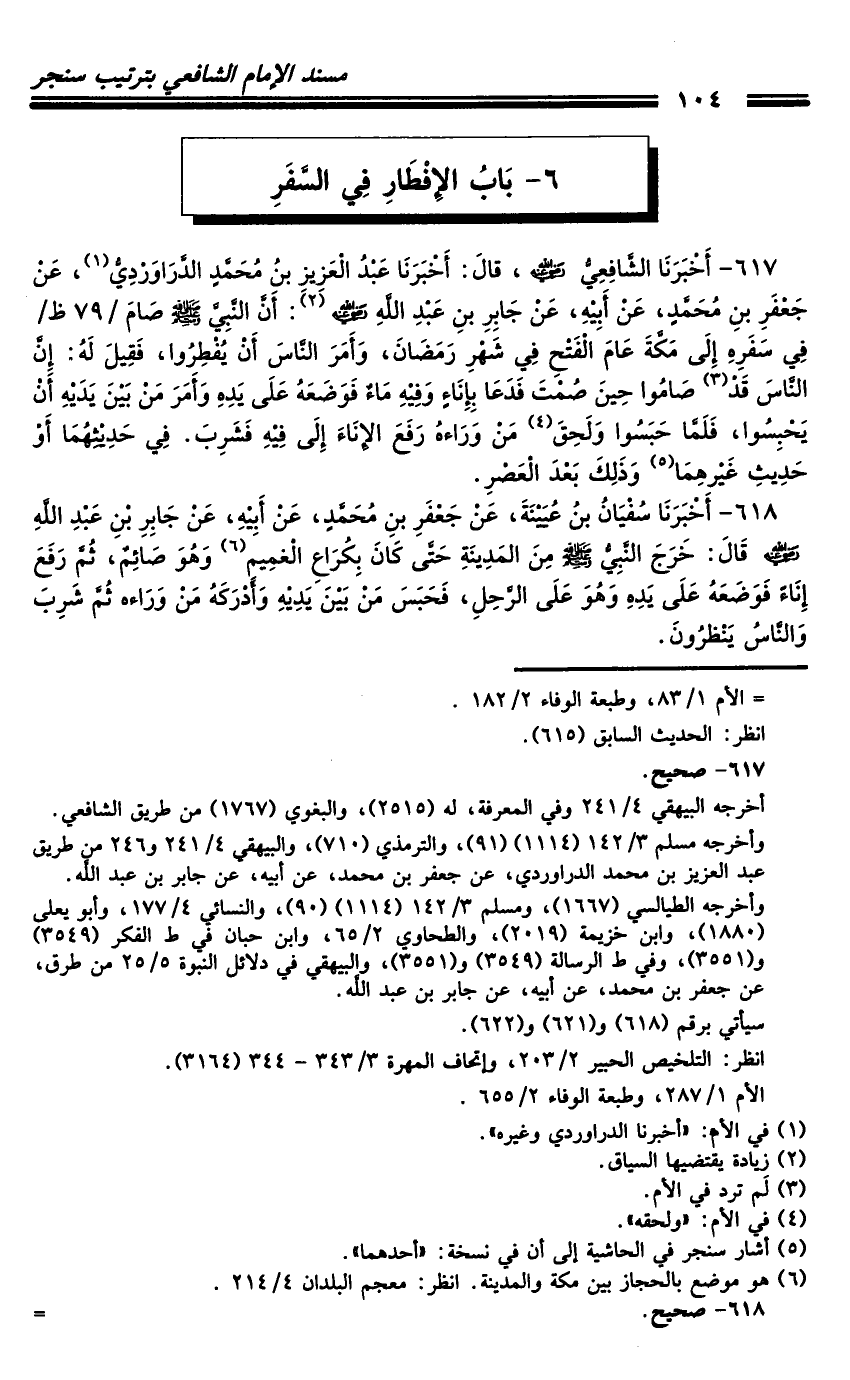617 - أَخْبَرَنَا الشَّافِعِيُّ رَضِيَ اللَّهُ عَنْهُ، قَالَ: أَخْبَرَنَا عَبْدُ الْعَزِيزِ بْنُ مُحَمَّدٍ الدَّرَاوَرْدِيُّ، عَنْ جَعْفَرِ بْنِ مُحَمَّدٍ، عَنْ أَبِيهِ، عَنْ جَابِرِ بْنِ عَبْدِ اللَّهِ رَضِيَ اللَّهُ عَنْهُ: أَنَّ النَّبِيَّ صَلَّى اللَّهُ عَلَيْهِ وَسَلَّمَ صَامَ فِي سَفَرِهِ إِلَى مَكَّةَ عَامَ الْفَتْحِ فِي شَهْرِ رَمَضَانَ، وَأَمَرَ النَّاسَ أَنْ يُفْطِرُوا، فَقِيلَ لَهُ: إِنَّ النَّاسَ قَدْ صَامُوا حِينَ صُمْتَ فَدَعَا بِإِنَاءٍ وَفِيهِ مَاءٌ فَوَضَعَهُ عَلَى يَدِهِ وَأَمَرَ مَنْ بَيْنَ يَدَيْهِ أَنْ يَحْسِبُوا، فَلَمَّا حَبَسُوا وَلَحِقَ مَنْ وَرَاءَهُ رَفَعَ الإِنَاءَ إِلَى فِيهِ فَشَرِبَ.