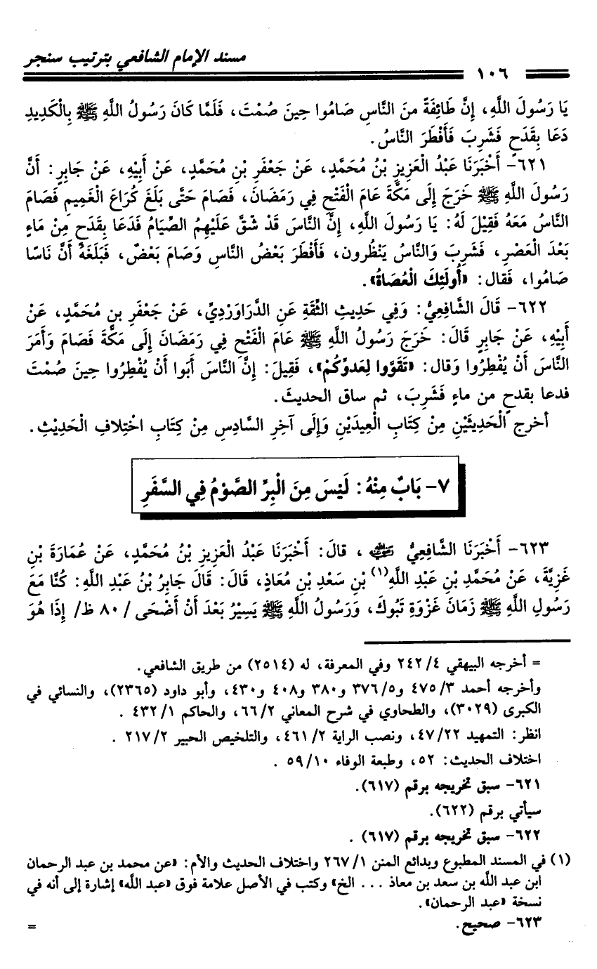 622 - قَالَ الشَّافِعِيُّ: وَفِي حَدِيثِ الثِّقَةِ، عَنِ الدَّرَاوَرْدِيِّ، عَنْ جَعْفَرِ بْنِ مُحَمَّدٍ، عَنْ أَبِيهِ، عَنْ جَابِرٍ، قَالَ: خَرَجَ رَسُولُ اللَّهِ صَلَّى اللَّهُ عَلَيْهِ وَسَلَّمَ عَامَ الْفَتْحِ فِي رَمَضَانَ إِلَى مَكَّةَ فَصَامَ وَأَمَرَ النَّاسَ أَنْ يُفْطِرُوا، وَقَالَ: «تَقَوَّوْا لِعَدُوِّكُمْ» ، فَقِيلَ: إِنَّ النَّاسَ أَبَوْا أَنْ يُفْطِرُوا حِينَ صُمْتَ فَدَعَا بِقَدَحٍ مِنْ مَاءٍ فَشَرِبَ، ثُمَّ سَاقَ الْحَدِيثَ.